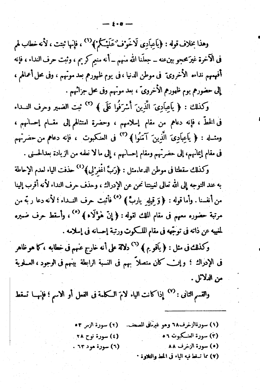 وكذلك: {يا عبادي الذين أسرفوا على} ثَبَتَ الضَّمِيرُ وَحَرْفُ النِّدَاءِ فِي الْخَطِّ فَإِنَّهُ دَعَاهُمْ مِنْ مَقَامِ إِسْلَامِهِمْ وَحَضْرَةِ امْتِثَالِهِمْ إِلَى مَقَامِ إِحْسَانِهِمْ وَمِثْلُهُ: {يَا عِبَادِيَ الَّذِينَ آمَنُوا} في العنكبوت فَإِنَّهُ دَعَاهُمْ مِنْ حَضَرَتِهِمْ فِي مَقَامِ إِيمَانِهِمْ إِلَى حَضْرَتِهِمْ وَمَقَامِ إِحْسَانِهِمْ إِلَى مَا لَا نَعْلَمُهُ مِنَ الزِّيَادَةِ بَعْدَ الْحُسْنَى