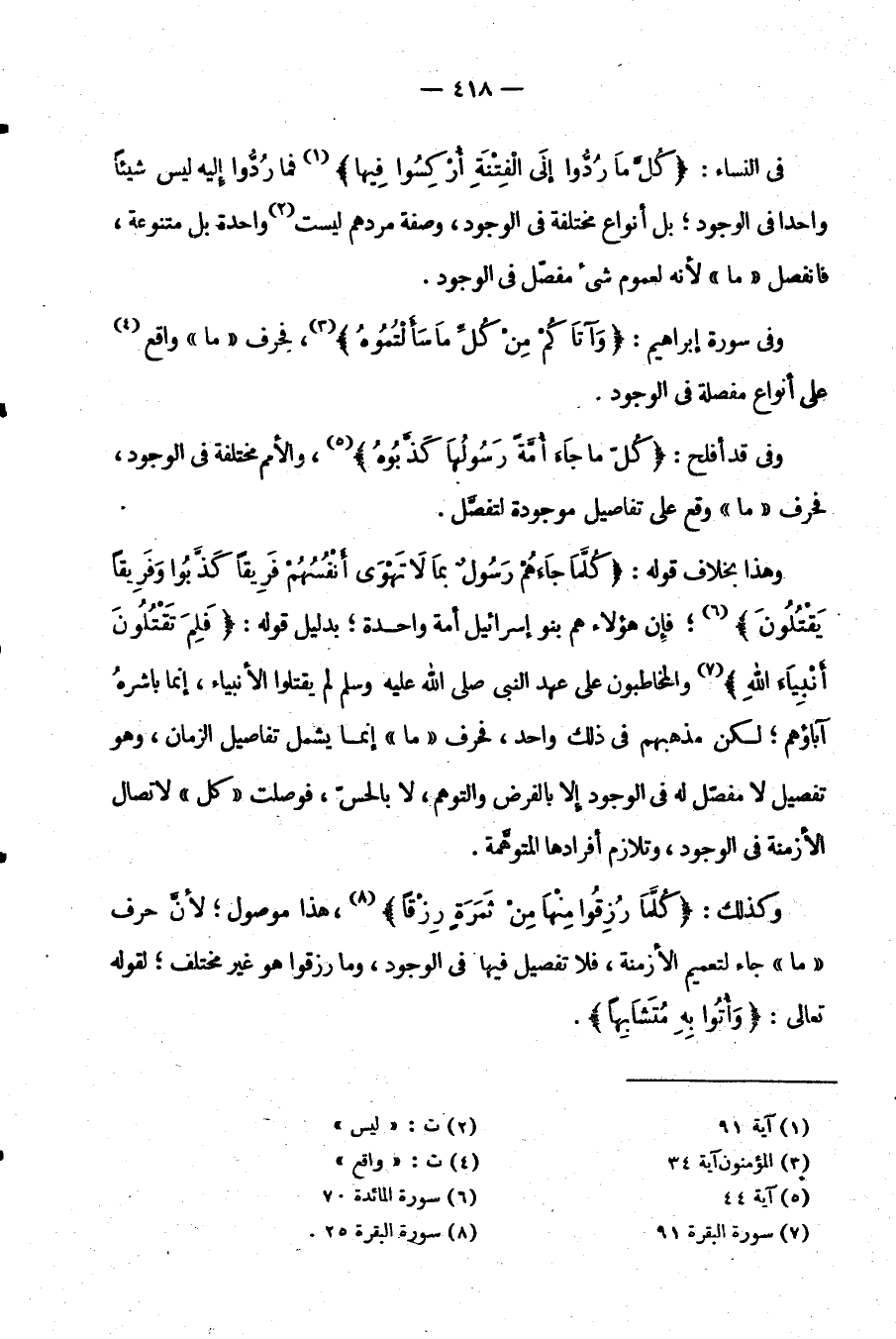 في النساء: {كل ما ردوا إلى الفتنة أركسوا فيها} فَمَا رُدُّوا إِلَيْهِ لَيْسَ شَيْئًا وَاحِدًا فِي الْوُجُودِ بَلْ أَنْوَاعٌ مُخْتَلِفَةٌ فِي الْوُجُودِ وَصِفَةُ مَرَدِّهِمْ لَيْسَتْ وَاحِدَةً بَلْ مُتَنَوِّعَةً فَانْفَصَلَ مَا لِأَنَّهُ لِعُمُومِ شَيْءٍ مُفَصَّلٍ فِي الْوُجُودِ