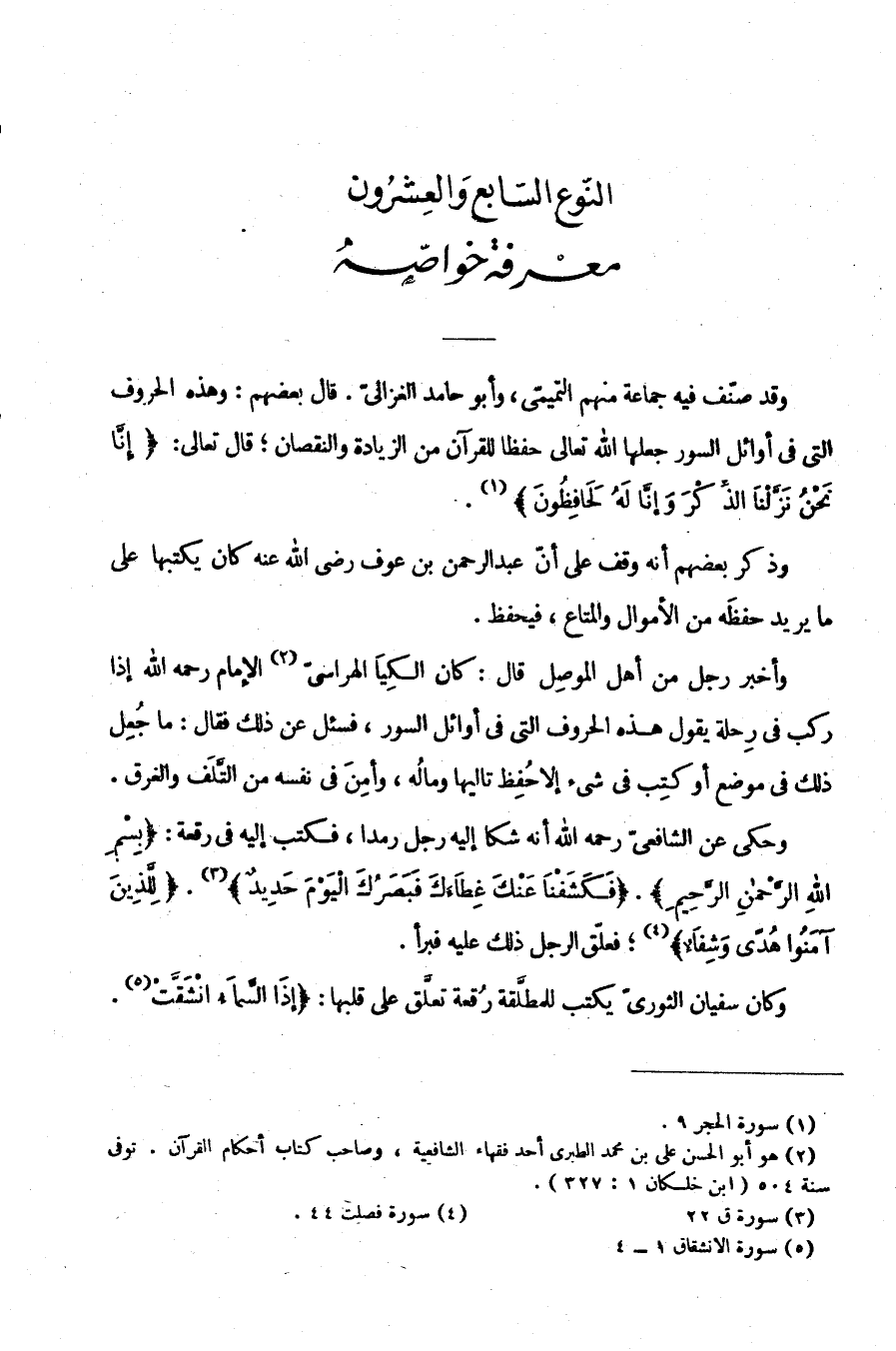 وَأَخْبَرَ رَجُلٌ مِنْ أَهْلِ الْمَوْصِلِ قَالَ كَانَ إِلْكِيَا الْهَرَّاسِيُّ الْإِمَامُ رَحِمَهُ اللَّهُ إِذَا رَكِبَ فِي رِحْلَةٍ يَقُولُ هَذِهِ الْحُرُوفَ الَّتِي فِي أَوَائِلِ السُّوَرِ فَسُئِلَ عَنْ ذَلِكَ فَقَالَ مَا جُعِلَ ذَلِكَ فِي مَوْضِعٍ أَوْ كُتِبَ فِي شَيْءٍ إِلَّا حُفِظَ تَالِيهَا وَمَالُهُ وَأَمِنَ فِي نَفْسِهِ مِنَ التَّلَفِ وَالْغَرَقِ
