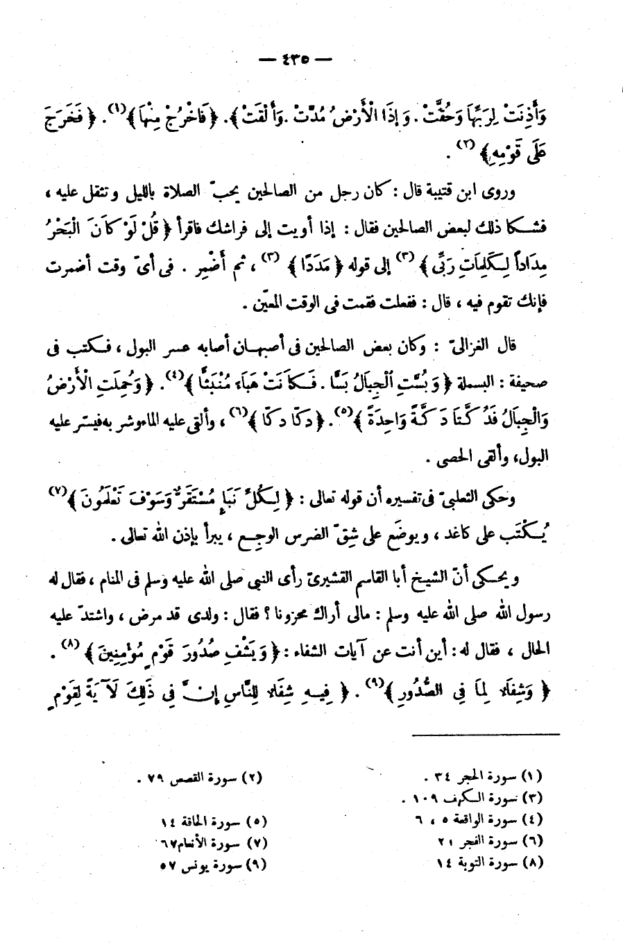 قَالَ الْغَزَالِيُّ وَكَانَ بَعْضُ الصَّالِحِينَ فِي أَصْبَهَانَ أَصَابَهُ عُسْرُ الْبَوْلِ فَكَتَبَ فِي صَحِيفَةٍ الْبَسْمَلَةَ: {وَبُسَّتِ الْجِبَالُ بَسًّا فَكَانَتْ هَبَاءً مُنْبَثًّا} {وحملت الأرض والجبال فدكتا دكة واحدة} {دكا دكا} وَأَلْقَى عَلَيْهِ الْمَاءَ وَشَرِبَهُ فَيَسَّرَ عَلَيْهِ الْبَوْلَ وَأَلْقَى الْحَصَى