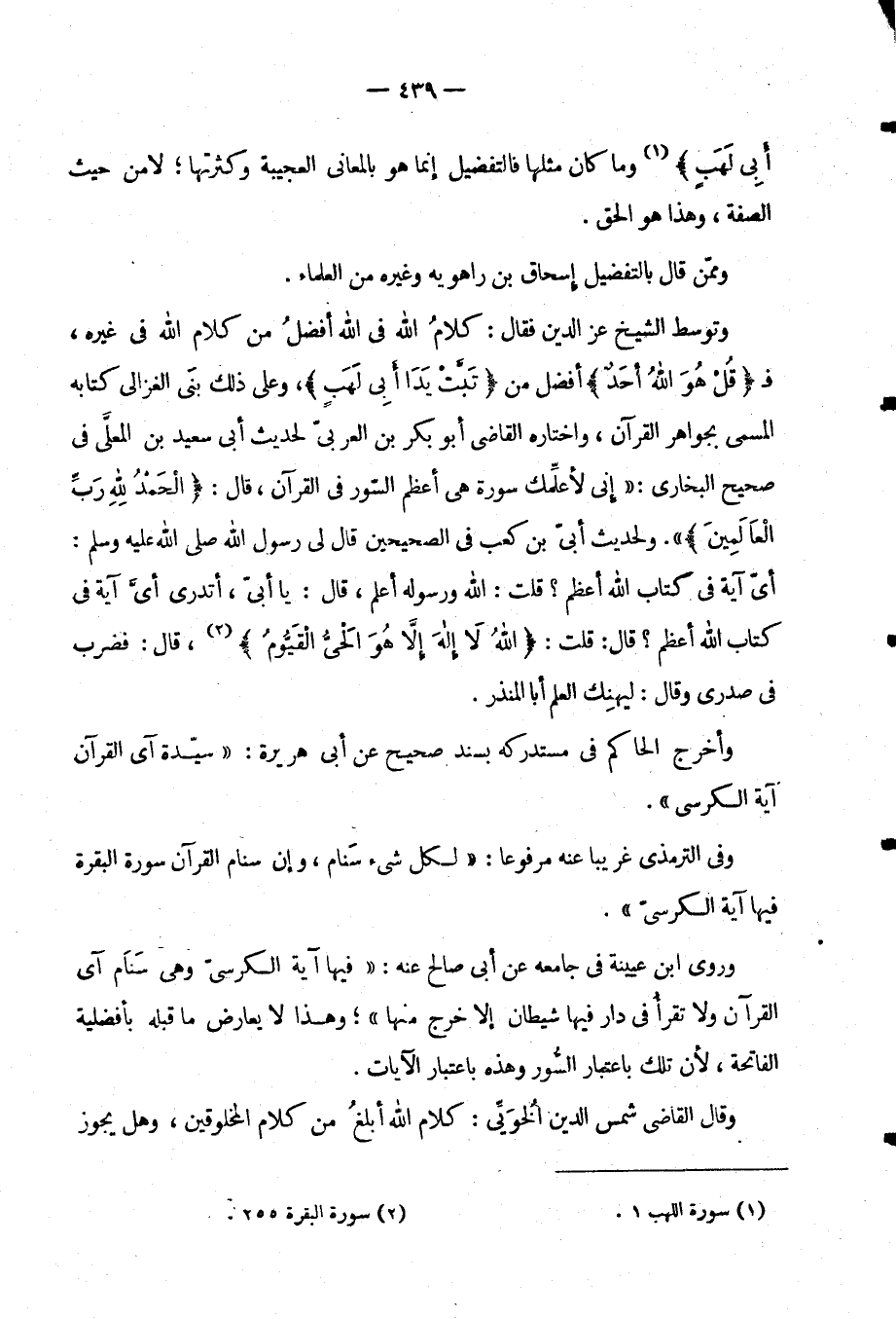 وَتَوَسَّطَ الشَّيْخُ عِزُّ الدِّينِ فَقَالَ: كَلَامُ اللَّهِ فِي اللَّهِ أَفْضَلُ مِنْ كَلَامِ اللَّهِ فِي غَيْرِهِ، فَـ {قُلْ هو الله أحد} أفضل من {تبت يدا أبي لهب وتب} وَعَلَى ذَلِكَ بَنَى الْغَزَالِيُّ كِتَابَهُ الْمُسَمَّى بِجَوَاهِرِ الْقُرْآنِ وَاخْتَارَهُ الْقَاضِي أَبُو بَكْرِ بْنُ الْعَرَبِيِّ لِحَدِيثِ أَبِي سَعِيدِ بْنِ الْمُعَلَّى فِي صَحِيحِ الْبُخَارِيِّ: "إِنِّي لَأُعَلِّمُكَ سُورَةً هِيَ أَعْظَمُ السُّوَرِ فِي الْقُرْآنِ قَالَ: {الْحَمْدُ لِلَّهِ رَبِّ الْعَالَمِينَ} وَلِحَدِيثِ أُبَّيِ بْنِ كَعْبٍ فِي الصَّحِيحَيْنِ قَالَ لِي رَسُولُ اللَّهِ صَلَّى اللَّهُ عَلَيْهِ وَسَلَّمَ: "أَيُّ آيَةٍ فِي كِتَابِ اللَّهِ أَعْظَمُ قُلْتُ اللَّهُ وَرَسُولُهُ أَعْلَمُ قَالَ يَا أُبَيُّ أَتَدْرِي أَيُّ آيَةٍ فِي كِتَابِ اللَّهِ أَعْظَمُ قَالَ قُلْتُ: {اللَّهُ لَا إِلَهَ إِلَّا هُوَ الْحَيُّ الْقَيُّومُ} قَالَ فَضَرَبَ فِي صَدْرِي وَقَالَ: "لِيَهْنِكَ الْعِلْمُ أَبَا الْمُنْذِرِ"