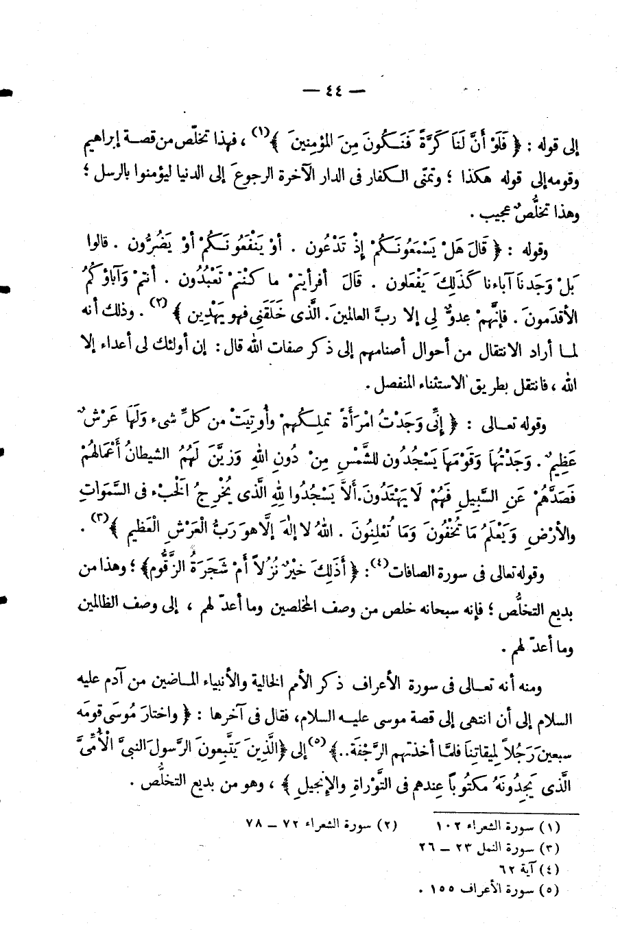 إِلَى قَوْلِهِ {فَلَوْ أَنَّ لَنَا كَرَّةً فَنَكُونَ من المؤمنين} فهذا تخلص من قصة إبراهيم وقومه إلى قوله هَكَذَا وَتَمَنِّي الْكُفَّارِ فِي الدَّارِ الْآخِرَةِ الرُّجُوعَ إِلَى الدُّنْيَا لِيُؤْمِنُوا بِالرُّسُلِ وَهَذَا تَخَلُّصٌ عَجِيبٌ
