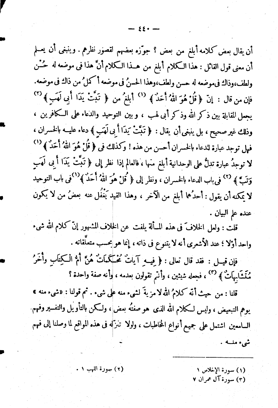 أَنْ يُقَالَ بَعْضُ كَلَامِهِ أَبْلَغُ مِنْ بَعْضٍ؟ جَوَّزَهُ بَعْضُهُمْ لِقُصُورِ نَظَرِهِمْ وَيَنْبَغِي أَنْ يُعْلَمَ أَنَّ مَعْنَى قَوْلِ الْقَائِلِ هَذَا الْكَلَامُ أَبْلَغُ مِنْ هَذَا الْكَلَامِ أَنَّ هَذَا فِي مَوْضِعِهِ لَهُ حُسْنٌ وَلُطْفٌ وَذَاكَ فِي مَوْضِعِهِ لَهُ حُسْنٌ وَلُطْفٌ وَهَذَا الْحَسَنُ فِي مَوْضِعِهِ أَكْمَلُ مِنْ ذَاكَ فِي مَوْضِعِهِ فَإِنَّ مَنْ قَالَ إن {قل هو الله أحد} أبلغ من {تبت يدا أبي لهب وتب} يَجْعَلُ الْمُقَابَلَةَ بَيْنَ ذِكْرِ اللَّهِ وَذِكْرِ أَبِي لَهَبٍ وَبَيْنَ التَّوْحِيدِ وَالدُّعَاءِ عَلَى الْكَافِرِينَ وَذَلِكَ غَيْرُ صَحِيحٍ بَلْ يَنْبَغِي أَنْ يُقَالَ: {تَبَّتْ يدا أبي لهب وتب} دُعَاءٌ عَلَيْهِ بِالْخُسْرَانِ فَهَلْ تُوجَدُ عِبَارَةٌ لِلدُّعَاءِ بِالْخُسْرَانِ أَحْسَنُ مِنْ هَذِهِ وَكَذَلِكَ فِي {قُلْ هُوَ اللَّهُ أَحَدٌ} لَا تُوجَدُ عِبَارَةٌ تَدُلُّ عَلَى الْوَحْدَانِيَّةِ أَبْلَغُ مِنْهَا فَالْعَالِمُ إِذَا نَظَرَ إِلَى: {تَبَّتْ يَدَا أَبِي لَهَبٍ وَتَبَّ} فِي بَابِ الدُّعَاءِ وَالْخُسْرَانِ وَنَظَرَ إِلَى {قُلْ هُوَ اللَّهُ أَحَدٌ} فِي بَابِ التَّوْحِيدِ لَا يُمْكِنُهُ أَنْ يَقُولَ أَحَدُهُمَا أَبْلَغُ مِنَ الْآخَرِ وَهَذَا الْقَيْدُ يَغْفُلُ عَنْهُ بَعْضُ مَنْ لَا يَكُونُ عِنْدَهُ عِلْمُ الْبَيَانِ