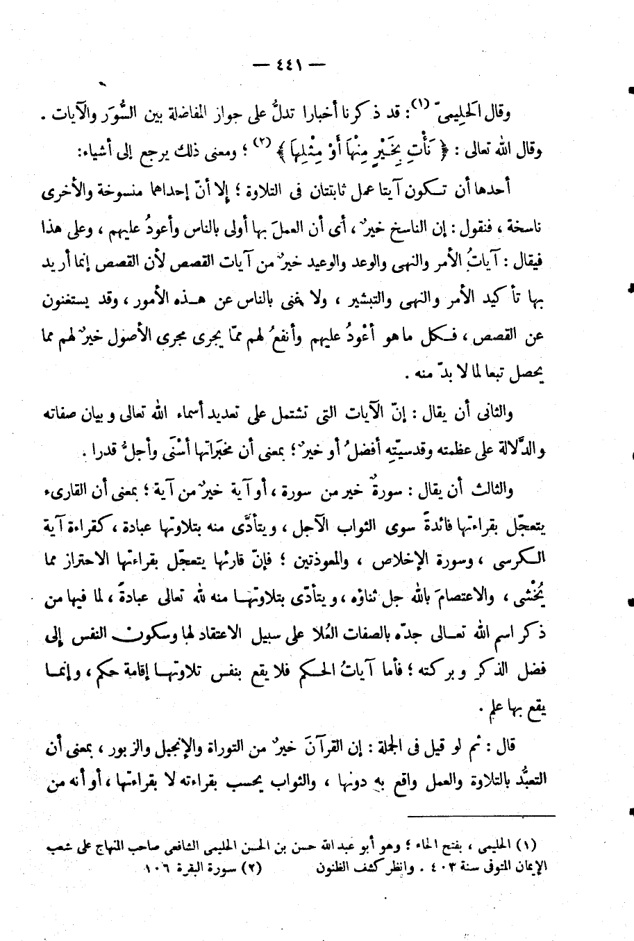 وقال الحليمي قد ذكرنا أخبار تدل على جوار الْمُفَاضَلَةِ بَيْنَ السُّوَرِ وَالْآيَاتِ وَقَالَ اللَّهُ تَعَالَى: {نأت بخير منها أو مثلها} وَمَعْنَى ذَلِكَ يَرْجِعُ إِلَى أَشْيَاءَ:
