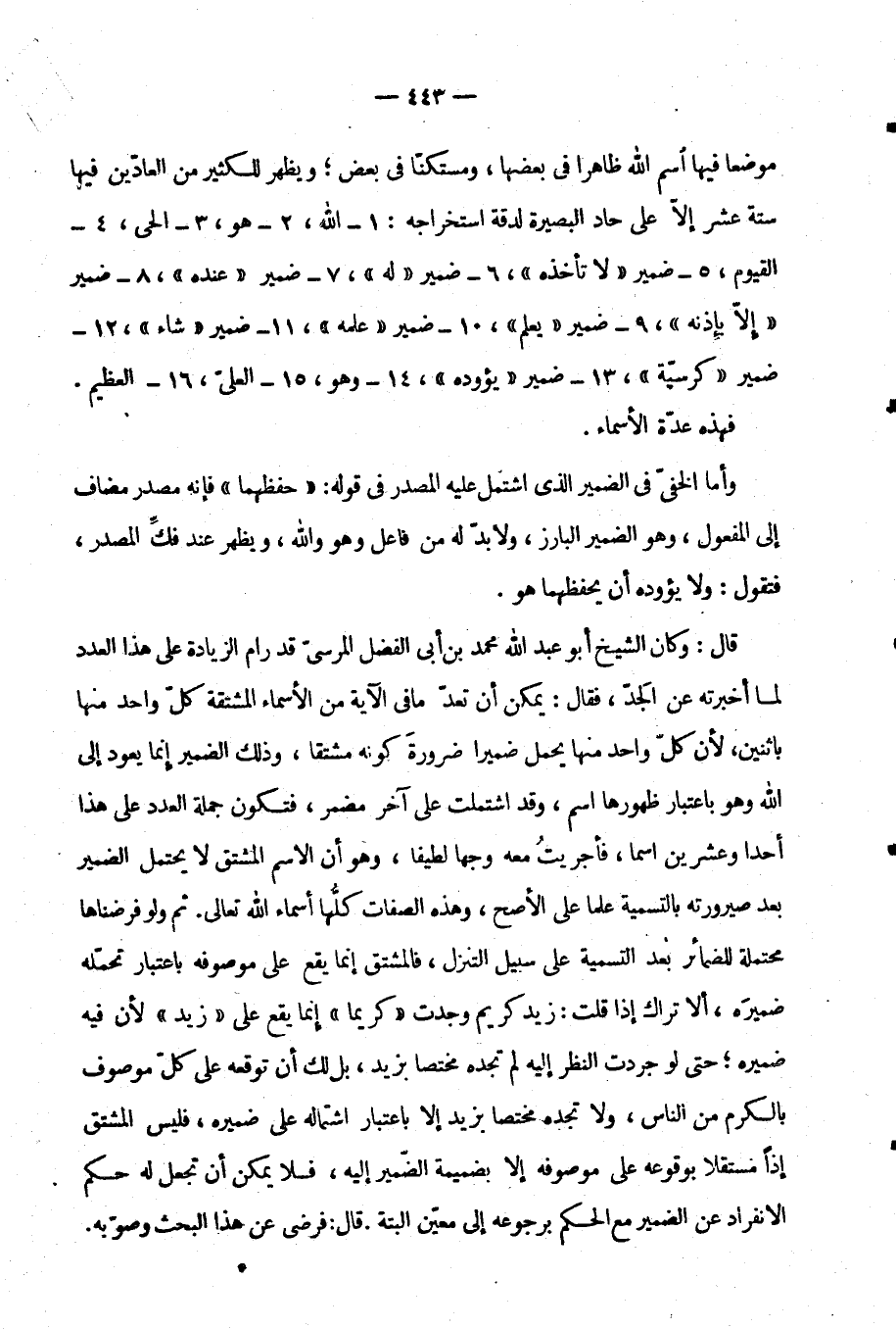 قَالَ وَكَانَ الشَّيْخُ أَبُو عبد الله محمد بن الْفَضْلِ الْمُرْسِيُّ قَدْ رَامَ الزِّيَادَةَ عَلَى هَذَا الْعَدَدِ لَمَّا أَخْبَرْتُهُ عَنِ الْجَدِّ فَقَالَ يُمْكِنُ أَنْ تُعَدَّ مَا فِي الْآيَةِ مِنَ الْأَسْمَاءِ المشتقة كل واحد مِنْهَا بِاثْنَيْنِ لِأَنَّ كُلَّ وَاحِدٍ مِنْهَا يَحْمِلُ ضَمِيرًا ضَرُورَةَ كَوْنِهِ مُشْتَقًّا وَذَلِكَ الضَّمِيرُ إِنَّمَا يَعُودُ إِلَى اللَّهِ وَهُوَ بِاعْتِبَارِ ظُهُورِهَا اسْمٌ وَقَدِ اشْتَمَلَتْ عَلَى آخَرَ مُضْمَرٍ فَتَكُونُ جُمْلَةُ الْعَدَدِ عَلَى هَذَا أَحَدًا وَعِشْرِينَ اسْمًا فَأَجْرَيْتُ مَعَهُ وَجْهًا لَطِيفًا وَهُوَ أَنَّ الِاسْمَ الْمُشْتَقَّ لَا يَحْتَمِلُ الضَّمِيرَ بَعْدَ صَيْرُورَتِهِ بِالتَّسْمِيَةِ عَلَمًا عَلَى الْأَصَحِّ وَهَذِهِ الصِّفَاتُ كُلُّهَا أَسْمَاءُ اللَّهِ تَعَالَى ثُمَّ وَلَوْ فَرَضْنَاهَا مُحْتَمِلَةً لِلضَّمَائِرِ بَعْدَ التَّسْمِيَةِ عَلَى سَبِيلِ التَّنَزُّلِ فَالْمُشْتَقُّ إِنَّمَا يَقَعُ عَلَى مَوْصُوفِهِ بِاعْتِبَارِ تَحَمُّلِهِ ضَمِيرَهُ أَلَا تَرَاكَ إذا قلت زيد كريم إذا وَجَدْتُ كَرِيمًا إِنَّمَا يَقَعُ عَلَى زَيْدٍ لِأَنَّ فِيهِ ضَمِيرَهُ حَتَّى لَوْ جَرَّدْتَ النَّظَرَ إِلَيْهِ لَمْ تَجِدْهُ مُخْتَصًّا بِزَيْدٍ بَلْ لَكَ أَنْ تُوقِعَهُ عَلَى كُلِّ مَوْصُوفٍ بِالْكَرَمِ مِنَ النَّاسِ وَلَا تَجِدُهُ مُخْتَصًّا بِزَيْدٍ إِلَّا بِاعْتِبَارِ اشْتِمَالِهِ عَلَى ضَمِيرِهِ فَلَيْسَ الْمُشْتَقُّ إِذًا مُسْتَقِلًّا بِوُقُوعِهِ عَلَى مَوْصُوفِهِ إِلَّا بِضَمِيمَةِ الضَّمِيرِ إِلَيْهِ فَلَا يمكن أن تجعله لَهُ حُكْمُ الِانْفِرَادِ عَنِ الضَّمِيرِ مَعَ الْحُكْمِ بِرُجُوعِهِ إِلَى مُعَيَّنٍ أَلْبَتَّةَ قَالَ فَرَضِيَ عَنْ هَذَا الْبَحْثِ وَصَوَّبَهُ