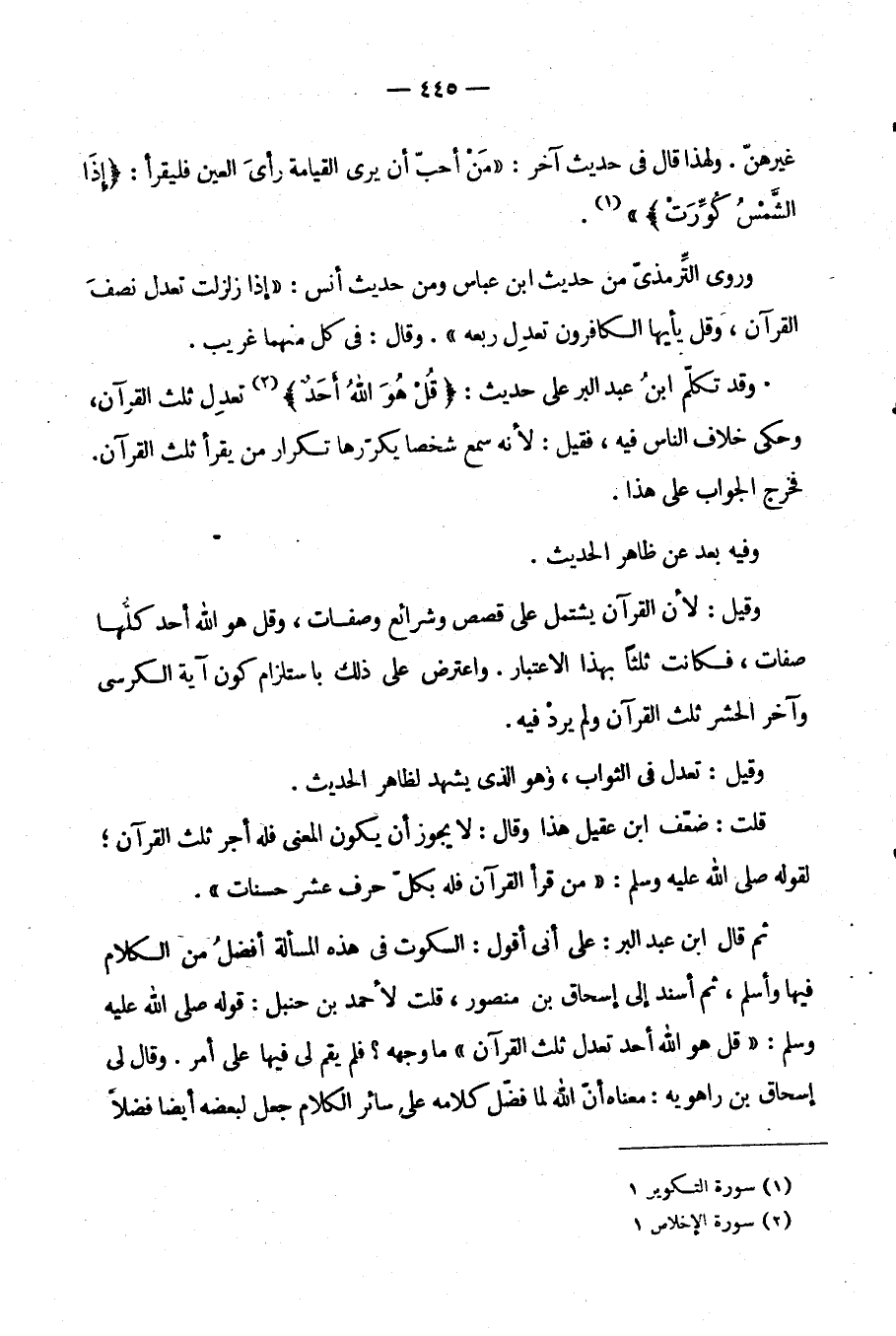 ثُمَّ قَالَ ابْنُ عَبْدِ الْبَرِّ عَلَى أَنِّي أَقُولُ السُّكُوتُ فِي هَذِهِ الْمَسْأَلَةِ أَفْضَلُ مِنَ الْكَلَامِ فِيهَا وَأَسْلَمُ ثُمَّ أَسْنَدَ إِلَى إِسْحَاقَ بْنِ مَنْصُورٍ قُلْتُ لِأَحْمَدَ بْنِ حَنْبَلٍ قَوْلُهُ صَلَّى اللَّهُ عَلَيْهِ وَسَلَّمَ: "قُلْ هُوَ اللَّهُ أَحَدٌ تَعْدِلُ ثُلُثَ الْقُرْآنِ" مَا وَجْهُهُ فَلَمْ يَقُمْ لِي فِيهَا عَلَى أَمْرٍ وَقَالَ لِي إِسْحَاقُ بْنُ رَاهَوَيْهِ مَعْنَاهُ أَنَّ اللَّهَ لَمَّا فَضَّلَ كَلَامَهُ عَلَى سَائِرِ الْكَلَامِ جَعَلَ لِبَعْضِهِ أَيْضًا فَضْلًا