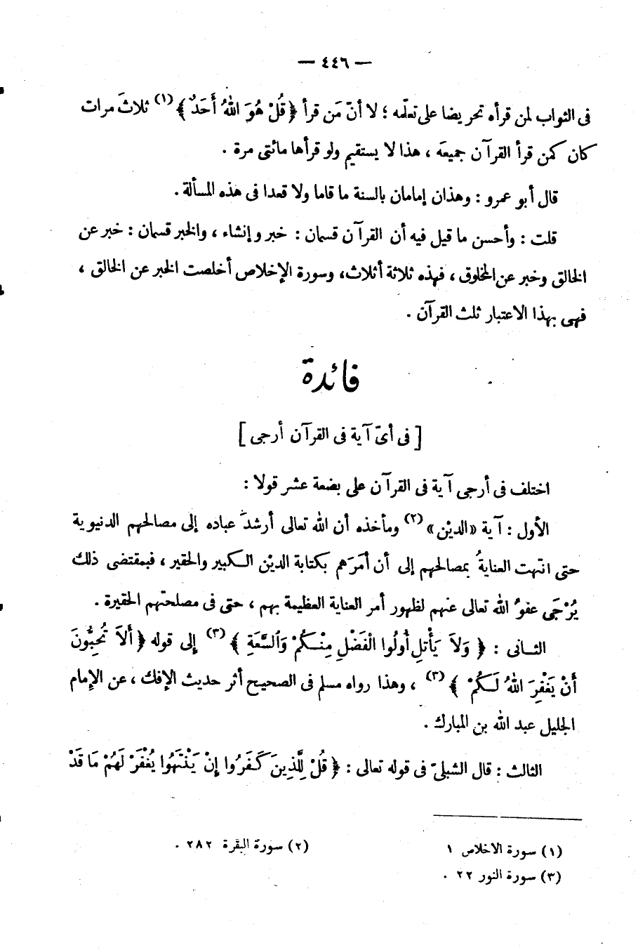 فِي الثَّوَابِ لِمَنْ قَرَأَهُ تَحْرِيضًا عَلَى تَعَلُّمِهِ لَا أَنَّ مَنْ قَرَأَ {قُلْ هُوَ اللَّهُ أَحَدٌ} ثَلَاثَ مَرَّاتٍ كَانَ كَمَنْ قَرَأَ الْقُرْآنَ جَمِيعَهُ هَذَا لَا يَسْتَقِيمُ وَلَوْ قَرَأَهَا مِائَتَيْ مرة