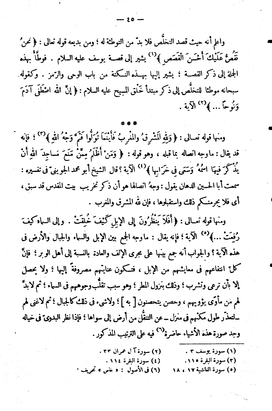 وَمِنْهَا قَوْلُهُ {أَفَلَا يَنْظُرُونَ إِلَى الْإِبِلِ كَيْفَ خُلِقَتْ وَإِلَى السَّمَاءِ كَيْفَ رُفِعَتْ} الآية فَإِنَّهُ يُقَالُ مَا وَجْهُ الْجَمْعِ بَيْنَ الْإِبِلِ وَالسَّمَاءِ وَالْجِبَالِ وَالْأَرْضِ فِي هَذِهِ الْآيَةِ وَالْجَوَابُ أنه جَمَعَ بَيْنَهُمَا عَلَى مَجْرَى الْإِلْفِ وَالْعَادَةِ بِالنِّسْبَةِ إلى أهل الوبر فإن كل انْتِفَاعِهِمْ فِي مَعَايِشِهِمْ مِنَ الْإِبِلِ فَتَكُونُ عِنَايَتُهُمْ مَصْرُوفَةً إِلَيْهَا وَلَا يَحْصُلُ إِلَّا بِأَنْ تَرْعَى وتشرب وذلك بنزول المطر وهو سبب تقلب وجوههم في السماء ثم لا بُدَّ لَهُمْ مِنْ مَأْوًى يُؤْوِيهِمْ وَحِصْنٍ يَتَحَصَّنُونَ بِهِ وَلَا شَيْءَ فِي ذَلِكَ كَالْجِبَالِ ثُمَّ لَا غِنًى لَهُمْ لِتَعَذُّرِ طُولِ مُكْثِهِمْ فِي مَنْزِلٍ عَنِ التَّنَقُّلِ مِنْ أَرْضٍ إِلَى سِوَاهَا فَإِذَا نَظَرَ الْبَدَوِيُّ فِي خَيَالِهِ وَجَدَ صُورَةَ هَذِهِ الْأَشْيَاءِ حَاضِرَةً فِيهِ عَلَى التَّرْتِيبِ الْمَذْكُورِ