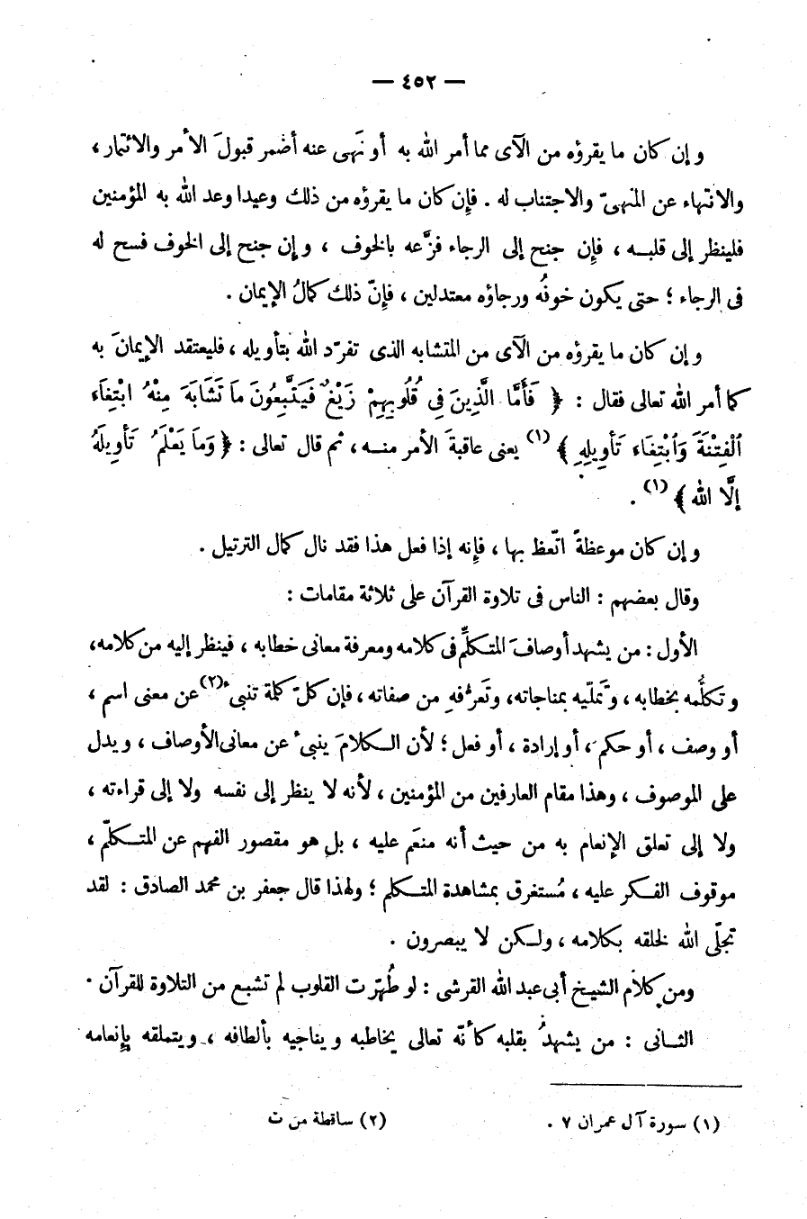الْأَوَّلُ: مَنْ يَشْهَدُ أَوْصَافَ الْمُتَكَلِّمِ فِي كَلَامِهِ وَمَعْرِفَةِ مَعَانِي خِطَابِهِ فَيَنْظُرُ إِلَيْهِ مِنْ كَلَامِهِ وَتَكَلُّمِهِ بِخِطَابِهِ وَتَمَلِّيهِ بِمُنَاجَاتِهِ وَتَعَرُّفِهِ مِنْ صِفَاتِهِ فَإِنَّ كُلَّ كَلِمَةٍ تُنْبِئُ عَنْ مَعْنَى اسْمٍ أَوْ وَصْفٍ أَوْ حُكْمٍ أَوْ إِرَادَةٍ أَوْ فِعْلٍ لِأَنَّ الْكَلَامَ يُنْبِئُ عَنْ مَعَانِي الْأَوْصَافِ وَيَدُلُّ عَلَى الْمَوْصُوفِ وَهَذَا مَقَامُ الْعَارِفِينَ مِنَ الْمُؤْمِنِينَ لِأَنَّهُ لَا يَنْظُرُ إِلَى نَفْسِهِ وَلَا إِلَى قِرَاءَتِهِ وَلَا إِلَى تَعَلُّقِ الْإِنْعَامِ بِهِ مِنْ حَيْثُ إِنَّهُ مُنْعِمٌ عَلَيْهِ بَلْ هُوَ مَقْصُورُ الْفَهْمِ عَنِ الْمُتَكَلِّمِ مَوْقُوفُ الْفِكْرِ عَلَيْهِ مُسْتَغْرِقٌ بِمُشَاهَدَةِ الْمُتَكَلِّمِ وَلِهَذَا قَالَ جَعْفَرُ بْنُ مُحَمَّدٍ الصَّادِقُ لَقَدْ تَجَلَّى اللَّهُ لِخَلْقِهِ بِكَلَامِهِ وَلَكِنْ لَا يُبْصِرُونَ
