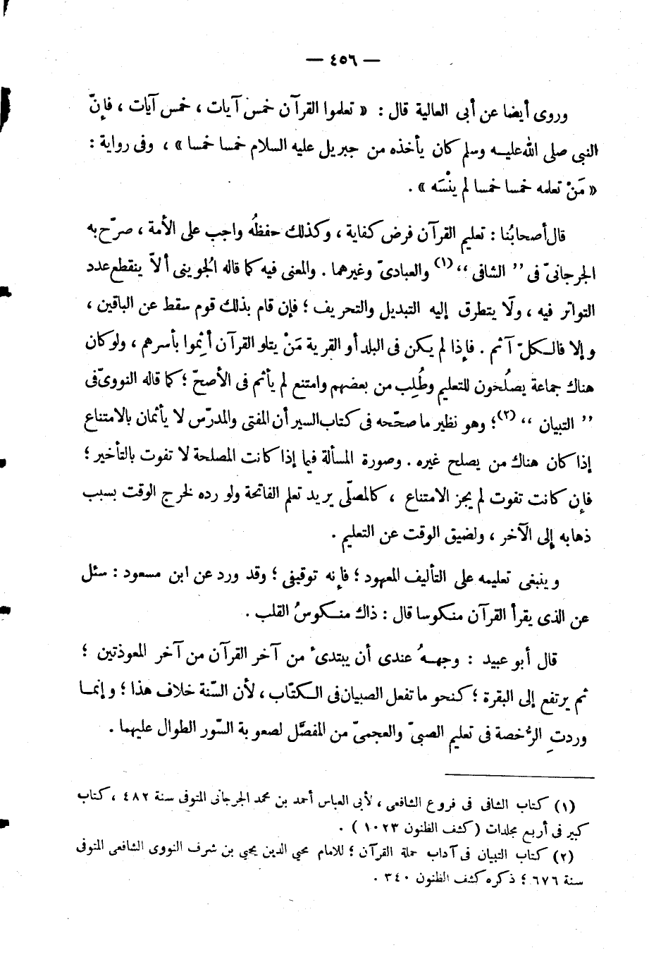 قَالَ أصحابنا: تَعْلِيمُ الْقُرْآنِ فَرْضُ كِفَايَةٍ وَكَذَلِكَ حِفْظُهُ وَاجِبٌ عَلَى الْأُمَّةِ صَرَّحَ بِهِ الْجُرْجَانِيُّ فِي الشَّافِي وَالْعَبَّادِيُّ وَغَيْرُهُمَا وَالْمَعْنَى فِيهِ كَمَا قَالَهُ الْجُوَيْنِيُّ أَلَّا يَنْقَطِعَ عَدَدُ التَّوَاتُرِ فِيهِ وَلَا يَتَطَرَّقَ إِلَيْهِ التَّبْدِيلُ وَالتَّحْرِيفُ فَإِنْ قَامَ بِذَلِكَ قَوْمٌ سَقَطَ عَنِ الْبَاقِينَ وَإِلَّا فَالْكُلُّ آثِمٌ فَإِذَا لَمْ يَكُنْ فِي الْبَلَدِ أَوِ الْقَرْيَةِ مَنْ يَتْلُو الْقُرْآنَ أَثِمُوا بِأَسْرِهِمْ وَلَوْ كَانَ هُنَاكَ جَمَاعَةٌ يَصْلُحُونَ لِلتَّعْلِيمِ وَطُلِبَ مِنْ بَعْضِهِمْ وَامْتَنَعَ لَمْ يَأْثَمْ فِي الْأَصَحِّ كَمَا قَالَهُ النَّوَوِيُّ فِي التِّبْيَانِ وَهُوَ نَظِيرُ مَا صَحَّحَهُ فِي كِتَابِ السِّيَرِ أَنَّ الْمُفْتِيَ وَالْمُدَرِّسَ لَا يَأْثَمَانِ بِالِامْتِنَاعِ إِذَا كَانَ هُنَاكَ مَنْ يَصْلُحُ غَيْرُهُ وَصُورَةُ الْمَسْأَلَةِ فِيمَا إِذَا كَانَتِ الْمَصْلَحَةُ لَا تَفُوتُ بِالتَّأْخِيرِ فَإِنْ كَانَتْ تَفُوتُ لَمْ يَجُزِ الِامْتِنَاعُ كَالْمُصَلِّي يُرِيدُ تَعَلُّمَ الْفَاتِحَةِ وَلَوْ رَدَّهُ لَخَرَجَ الْوَقْتُ بِسَبَبِ ذَهَابِهِ إِلَى الْآخَرِ وَلِضِيقِ الْوَقْتِ عَنِ التَّعْلِيمِ