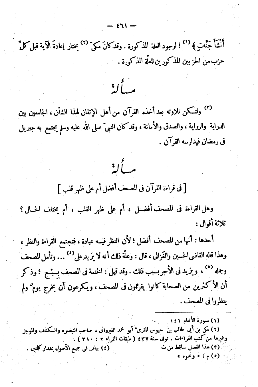 أَحَدُهَا أَنَّهَا مِنَ الْمُصْحَفِ أَفْضَلُ لِأَنَّ النَّظَرَ فِيهِ عِبَادَةٌ فَتَجْتَمِعُ الْقِرَاءَةُ وَالنَّظَرُ وَهَذَا قَالَهُ الْقَاضِي الْحُسَيْنُ وَالْغَزَالِيُّ قَالَ وَعِلَّةُ ذَلِكَ أَنَّهُ لَا يَزِيدُ عَلَى. . . . . . وَتَأَمُّلِ الْمُصْحَفِ وَجُمَلِهِ وَيَزِيدُ فِي الْأَجْرِ بِسَبَبِ ذَلِكَ وَقَدْ قِيلَ الْخَتْمَةُ فِي الْمُصْحَفِ بِسَبْعٍ وَذُكِرَ أَنَّ الْأَكْثَرِينَ مِنَ الصَّحَابَةِ كَانُوا يَقْرَءُونَ فِي الْمُصْحَفِ وَيَكْرَهُونَ أَنْ يَخْرُجَ يَوْمٌ وَلَمْ يَنْظُرُوا فِي الْمُصْحَفِ