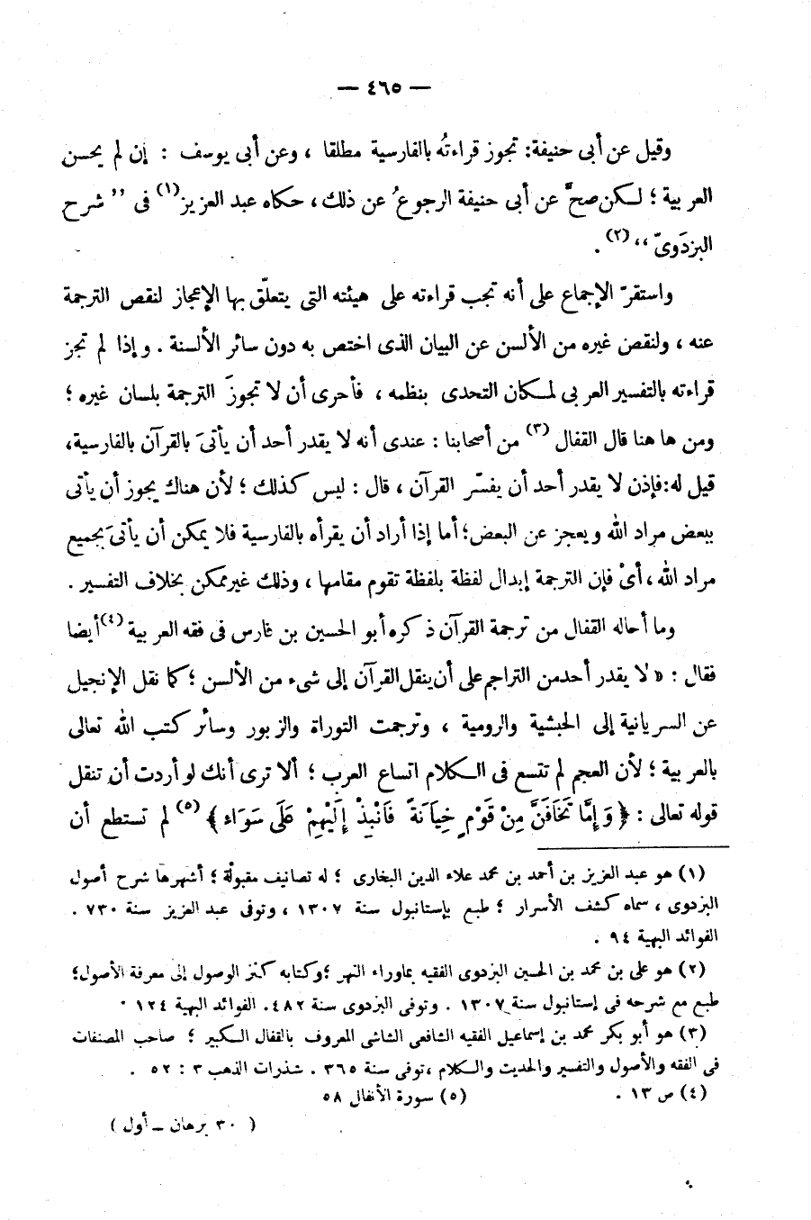 وَاسْتَقَرَّ الْإِجْمَاعُ عَلَى أَنَّهُ تَجِبُ قِرَاءَتُهُ عَلَى هَيْئَتِهِ الَّتِي يَتَعَلَّقُ بِهَا الْإِعْجَازُ لِنَقْصِ التَّرْجَمَةِ عَنْهُ وَلِنَقْصِ غَيْرِهِ مِنَ الْأَلْسُنِ عَنِ الْبَيَانِ الَّذِي اخْتَصَّ بِهِ دُونَ سَائِرِ الْأَلْسِنَةِ وَإِذَا لَمْ تَجُزْ قِرَاءَتُهُ بِالتَّفْسِيرِ الْعَرَبِيِّ لِمَكَانِ التَّحَدِّي بِنَظْمِهِ فَأَحْرَى أَنْ لَا تَجُوزَ التَّرْجَمَةُ بِلِسَانِ غَيْرِهِ وَمِنْ هَاهُنَا قَالَ الْقَفَّالُ مِنْ أَصْحَابِنَا عِنْدِي أَنَّهُ لَا يَقْدِرُ أَحَدٌ أَنْ يَأْتِيَ بِالْقُرْآنِ بِالْفَارِسِيَّةِ قِيلَ لَهُ فَإِذَنْ لَا يَقْدِرُ أَحَدٌ أَنْ يُفَسِّرَ الْقُرْآنَ قَالَ لَيْسَ كَذَلِكَ لِأَنَّ هُنَاكَ يَجُوزُ أَنْ يَأْتِيَ بِبَعْضِ مُرَادِ اللَّهِ وَيَعْجِزَ عَنِ الْبَعْضِ أَمَّا إِذَا أَرَادَ أَنْ يَقْرَأَهُ بِالْفَارِسِيَّةِ فَلَا يُمْكِنُ أَنْ يَأْتِيَ بِجَمِيعِ مُرَادِ اللَّهِ أَيْ فَإِنَّ التَّرْجَمَةَ إِبْدَالُ لَفْظَةٍ بِلَفْظَةٍ تَقُومُ مَقَامَهَا وَذَلِكَ غَيْرُ مُمْكِنٍ بِخِلَافِ التَّفْسِيرِ وَمَا أَحَالَهُ الْقَفَّالُ مِنْ تَرْجَمَةِ الْقُرْآنِ ذَكَرَهُ أَبُو الْحُسَيْنُ بْنُ فَارِسٍ فِي فِقْهِ الْعَرَبِيَّةِ أَيْضًا فَقَالَ لَا يَقْدِرُ أَحَدٌ مِنَ التَّرَاجِمِ عَلَى أَنْ يَنْقُلَ الْقُرْآنَ إِلَى شَيْءٍ مِنَ الْأَلْسُنِ كَمَا نُقِلَ الْإِنْجِيلُ عَنِ السُّرْيَانِيَّةِ إِلَى الْحَبَشِيَّةِ وَالرُّومِيَّةِ وَتُرْجِمَتِ التَّوْرَاةُ وَالزَّبُورُ وَسَائِرُ كُتُبِ اللَّهِ تَعَالَى بِالْعَرَبِيَّةِ لِأَنَّ الْعَجَمَ لَمْ تَتَّسِعْ فِي الْكَلَامِ اتِّسَاعَ الْعَرَبِ أَلَا تَرَى أَنَّكَ لَوْ أَرَدْتَ أَنْ تَنْقُلَ قَوْلَهُ تَعَالَى: {وَإِمَّا تَخَافَنَّ مِنْ قَوْمٍ خِيَانَةً فَانْبِذْ إليهم على سواء} لَمْ تَسْتَطِعْ أَنْ