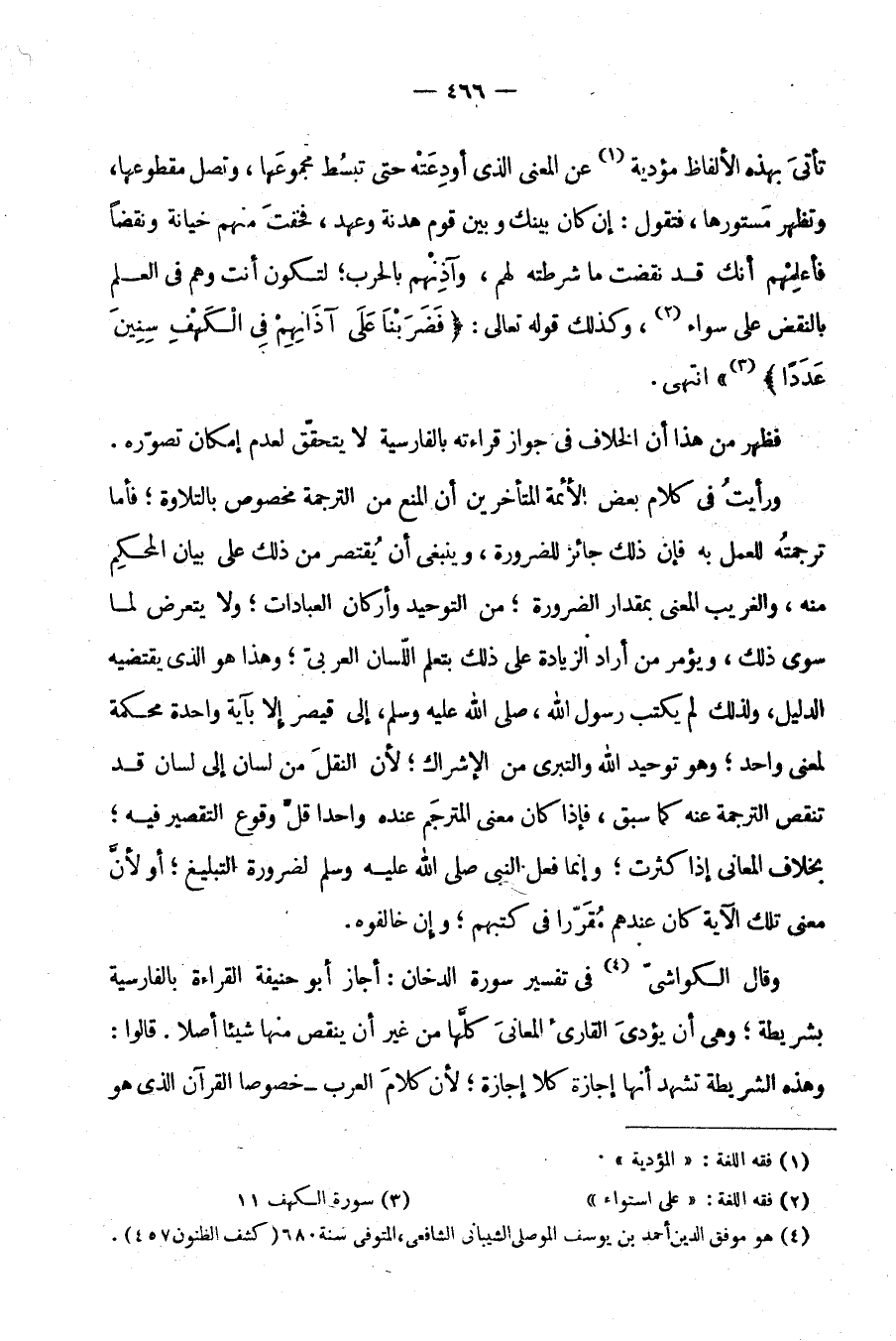 وَقَالَ الْكَوَاشِيُّ فِي تَفْسِيرِ سُورَةِ الدُّخَانِ: أَجَازَ أَبُو حَنِيفَةَ الْقِرَاءَةَ بِالْفَارِسِيَّةِ بِشَرِيطَةٍ وَهَى أَنْ يُؤَدِّيَ الْقَارِئُ الْمَعَانِيَ كُلَّهَا مِنْ غَيْرِ أَنْ يَنْقُصَ مِنْهَا شَيْئًا أَصْلًا قَالُوا وَهَذِهِ الشَّرِيطَةُ تَشْهَدُ أَنَّهَا إِجَازَةٌ كَلَا إِجَازَةٍ لِأَنَّ كَلَامَ الْعَرَبِ خُصُوصًا الْقُرْآنَ الَّذِي هُوَ