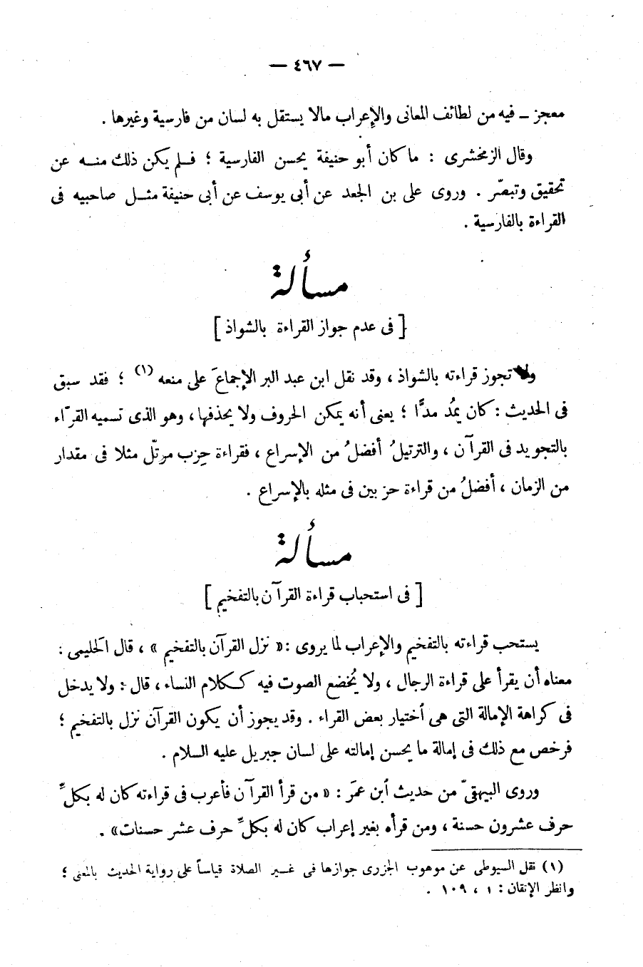 وَلَا تَجُوزُ قِرَاءَتُهُ بِالشَّوَاذِّ وَقَدْ نَقَلَ ابْنُ عَبْدِ الْبَرِّ الْإِجْمَاعَ عَلَى مَنْعِهِ فَقَدْ سَبَقَ فِي الْحَدِيثِ كَانَ يَمُدُّ مَدًّا يَعْنِي أَنَّهُ يُمَكِّنُ الْحُرُوفَ وَلَا يَحْذِفُهَا وَهُوَ الَّذِي يُسَمِّيهِ الْقُرَّاءُ بِالتَّجْوِيدِ فِي الْقُرْآنِ وَالتَّرْتِيلُ أَفْضَلُ مِنَ الْإِسْرَاعِ فَقِرَاءَةُ حِزْبٍ مُرَتَّلٍ مَثَلًا فِي مِقْدَارٍ مِنَ الزَّمَانِ أَفْضَلُ مِنْ قِرَاءَةِ حِزْبَيْنِ فِي مثله بالإسراع