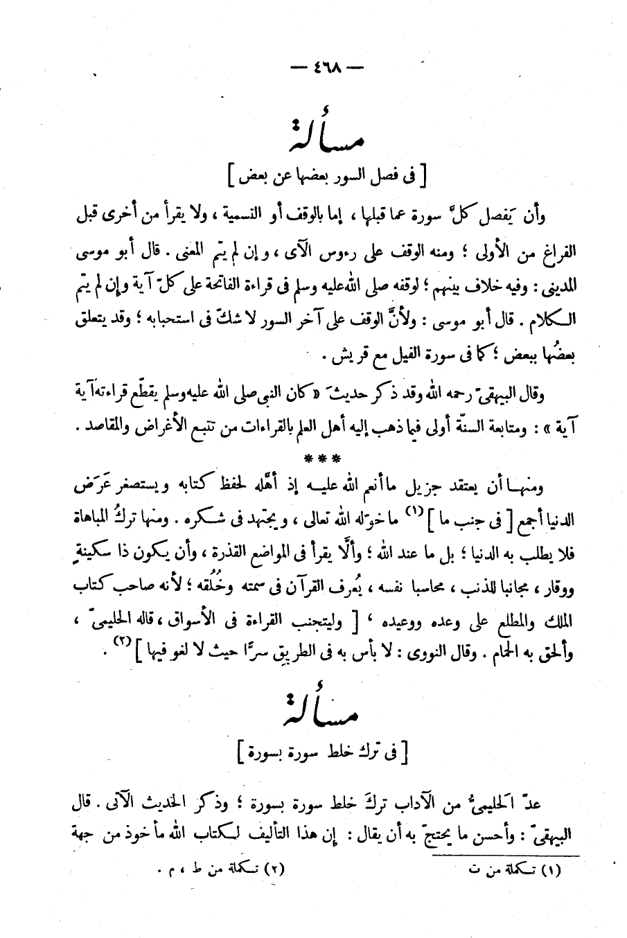 وَأَنْ يَفْصِلَ كُلَّ سُورَةٍ عَمَّا قَبْلَهَا إِمَّا بِالْوَقْفِ أَوِ التَّسْمِيَةِ وَلَا يَقْرَأَ مِنْ أُخْرَى قَبْلَ الْفَرَاغِ مِنَ الْأُولَى وَمِنْهُ الْوَقْفُ عَلَى رُءُوسِ الْآيِ وَإِنْ لَمْ يَتِمَّ الْمَعْنَى قَالَ أَبُو مُوسَى الْمَدِينِيُّ وَفِيهِ خِلَافٌ بَيْنَهُمْ لِوَقْفِهِ صَلَّى اللَّهُ عَلَيْهِ وَسَلَّمَ فِي قِرَاءَةِ الْفَاتِحَةِ عَلَى كُلِّ آيَةٍ وَإِنْ لَمْ يَتِمَّ الْكَلَامُ قَالَ أَبُو مُوسَى وَلِأَنَّ الْوَقْفَ عَلَى آخِرِ السُّوَرِ لَا شَكَّ فِي اسْتِحْبَابِهِ وَقَدْ يَتَعَلَّقُ بَعْضُهَا بِبَعْضٍ كَمَا فِي سُورَةِ الْفِيلِ مَعَ قُرَيْشٍ