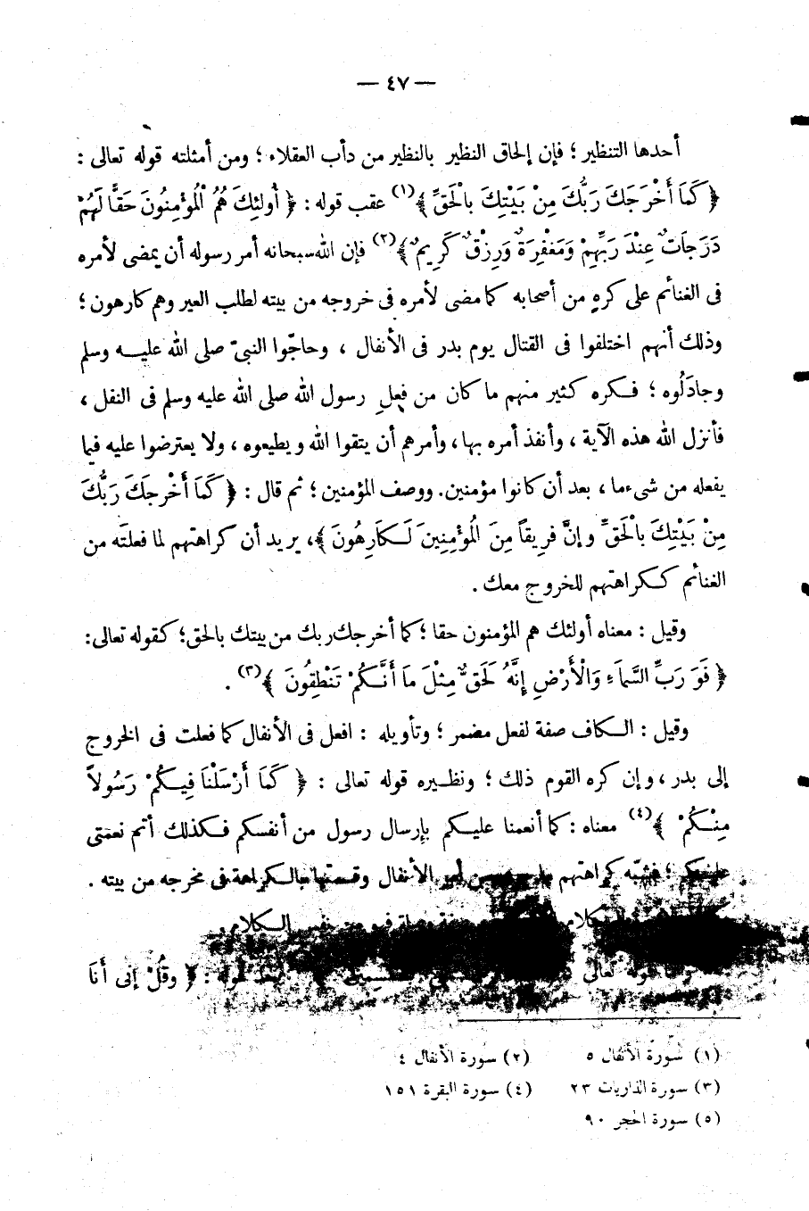أَحَدُهَا: التَّنْظِيرُ فَإِنَّ إِلْحَاقَ النَّظِيرِ بِالنَّظِيرِ مِنْ دَأْبِ الْعُقَلَاءِ وَمِنْ أَمْثِلَتِهِ قَوْلُهُ تَعَالَى {كَمَا أخرجك ربك من بيتك بالحق} عَقِبَ قَوْلِهِ {أُولَئِكَ هُمُ الْمُؤْمِنُونَ حَقًّا لَهُمْ درجات عند ربهم ومغفرة ورزق كريم} فَإِنَّ اللَّهَ سُبْحَانَهُ أَمَرَ رَسُولَهُ أَنْ يَمْضِيَ لِأَمْرِهِ فِي الْغَنَائِمِ عَلَى كُرْهٍ مِنْ أَصْحَابِهِ كَمَا مَضَى لِأَمْرِهِ فِي خُرُوجِهِ مِنْ بَيْتِهِ لِطَلَبِ الْعِيرِ وَهُمْ كَارِهُونَ وَذَلِكَ أَنَّهُمُ اخْتَلَفُوا فِي الْقِتَالِ يَوْمَ بَدْرٍ فِي الْأَنْفَالِ وَحَاجُّوا النَّبِيَّ صَلَّى اللَّهُ عَلَيْهِ وَسَلَّمَ وَجَادَلُوهُ فَكَرِهَ كَثِيرٌ مِنْهُمْ مَا كَانَ مِنْ فِعْلِ رَسُولِ اللَّهِ صَلَّى اللَّهُ عَلَيْهِ وَسَلَّمَ فِي النَّفْلِ فَأَنْزَلَ اللَّهُ هَذِهِ الْآيَةَ وَأَنْفَذَ أَمْرَهُ بِهَا وَأَمْرَهُمْ أَنْ يَتَّقُوا اللَّهَ وَيُطِيعُوهُ وَلَا يَعْتَرِضُوا عَلَيْهِ فِيمَا يَفْعَلُهُ مِنْ شَيْءٍ مَا، بَعْدَ أَنْ كَانُوا مُؤْمِنِينَ وَوَصَفَ الْمُؤْمِنِينَ ثُمَّ قَالَ {كَمَا أَخْرَجَكَ رَبُّكَ مِنْ بَيْتِكَ بِالْحَقِّ وَإِنَّ فريقا من المؤمنين لكارهون} يريد أن كراهتهم لِمَا فَعَلْتَهُ مِنَ الْغَنَائِمِ كَكَرَاهَتِهِمْ لِلْخُرُوجِ مَعَكَ