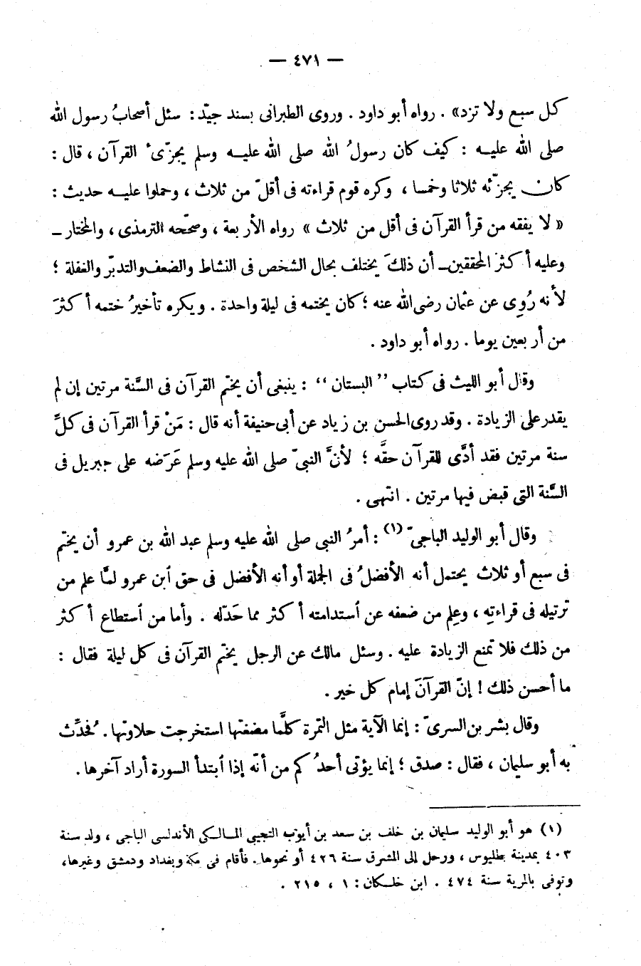 وَقَالَ أَبُو الْوَلِيدِ الْبَاجِيُّ أَمْرُ النَّبِيِّ صَلَّى اللَّهُ عَلَيْهِ وَسَلَّمَ عَبْدَ اللَّهِ بْنَ عَمْرٍو أَنْ يَخْتِمَ فِي سَبْعٍ أَوْ ثَلَاثٍ يُحْتَمَلُ أَنَّهُ الْأَفْضَلُ فِي الْجُمْلَةِ أَوْ أَنَّهُ الْأَفْضَلُ فِي حَقِّ ابْنِ عَمْرٍو لِمَا عَلِمَ مِنْ تَرْتِيلِهِ فِي قِرَاءَتِهِ وَعَلِمَ مِنْ ضَعْفِهِ عَنِ اسْتَدَامَتِهِ أَكْثَرَ مِمَّا حَدَّ لَهُ وَأَمَّا مَنِ اسْتَطَاعَ أَكْثَرَ مِنْ ذَلِكَ فَلَا تُمْنَعُ الزِّيَادَةُ عَلَيْهِ وَسُئِلَ مَالِكٌ عَنِ الرَّجُلِ يَخْتِمُ الْقُرْآنَ فِي كُلِّ لَيْلَةٍ فَقَالَ مَا أَحْسَنَ ذَلِكَ إِنَّ الْقُرْآنَ إِمَامُ كُلِّ خَيْرٍ