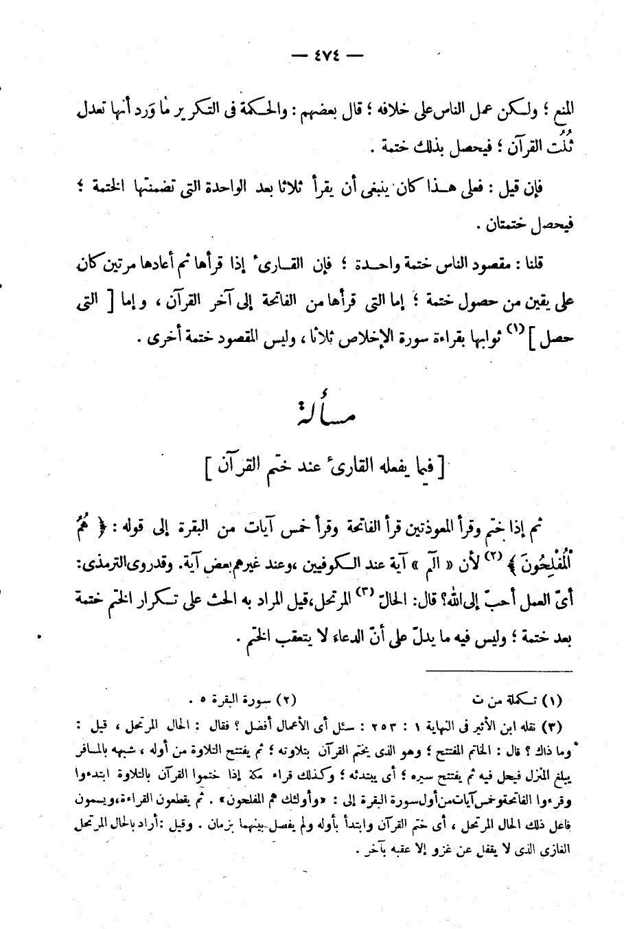 قُلْنَا: مَقْصُودُ النَّاسِ خَتْمَةٌ وَاحِدَةٌ فَإِنَّ القارئ إذا قَرَأَهَا ثُمَّ أَعَادَهَا مَرَّتَيْنِ كَانَ عَلَى يَقِينٍ مِنْ حُصُولِ خَتْمَةٍ إِمَّا الَّتِي قَرَأَهَا مِنَ الْفَاتِحَةِ إِلَى آخِرِ الْقُرْآنِ وَإِمَّا الَّتِي حَصَلَ ثَوَابُهَا بِقِرَاءَةِ سُورَةِ الْإِخْلَاصِ ثَلَاثًا وَلَيْسَ الْمَقْصُودُ ختمة أخرى