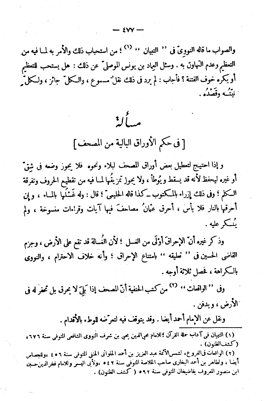 وَفَى الْوَاقِعَاتِ مِنْ كُتُبِ الْحَنَفِيَّةِ أَنَّ الْمُصْحَفَ إذا بلي لا يحرق بل تحفر لَهُ فِي الْأَرْضِ وَيُدْفَنُ