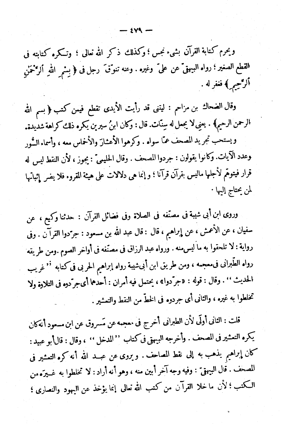 قُلْتُ: الثَّانِي أَوْلَى لِأَنَّ الطَّبَرَانِيَّ أَخْرَجَ فِي مُعْجَمِهِ عَنْ مَسْرُوقٍ عَنِ ابْنِ مَسْعُودٍ أَنَّهُ كَانَ يَكْرَهُ التَّعْشِيرَ فِي الْمُصْحَفِ وَأَخْرَجَهُ الْبَيْهَقِيُّ فِي كِتَابِ الْمَدْخَلِ وَقَالَ قَالَ أَبُو عُبَيْدٍ كَانَ إِبْرَاهِيمُ يَذْهَبُ بِهِ إِلَى نَقْطِ الْمَصَاحِفِ