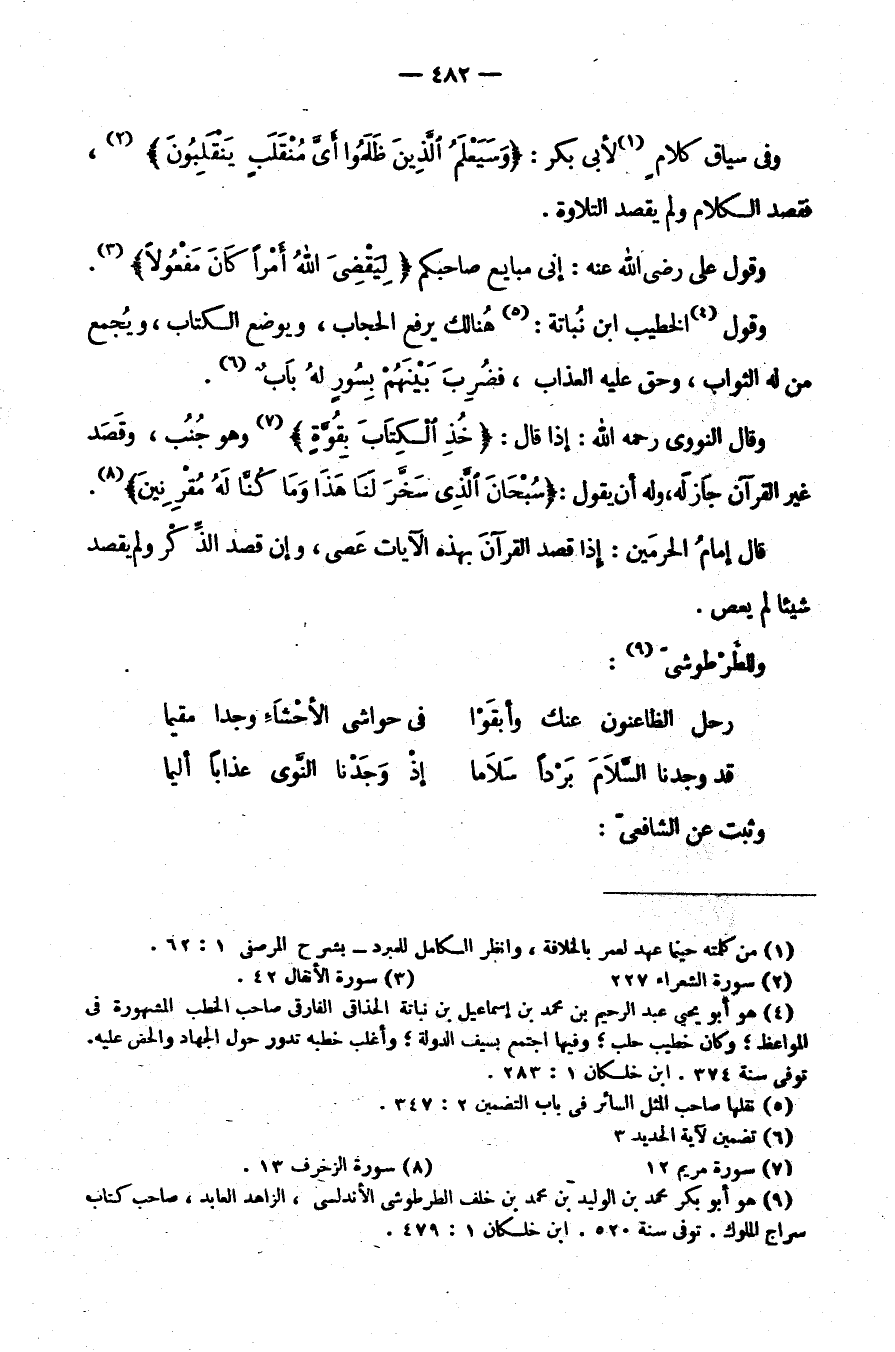 وفى سياق كلام لأبي بكر: {وَسَيَعْلَمُ الَّذِينَ ظَلَمُوا أَيَّ مُنْقَلَبٍ يَنْقَلِبُونَ} فَقَصَدَ الْكَلَامَ وَلَمْ يَقْصِدِ التِّلَاوَةَ