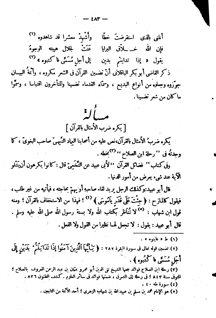 يُكْرَهُ ضَرْبُ الْأَمْثَالِ بِالْقُرْآنِ نَصَّ عَلَيْهِ مِنْ أَصْحَابِنَا الْعِمَادُ النِّيهِيُّ صَاحِبُ الْبَغَوِيِّ كَمَا وَجَدْتُهُ فِي رِحْلَةِ ابْنِ الصَّلَاحِ بِخَطِّهِ.