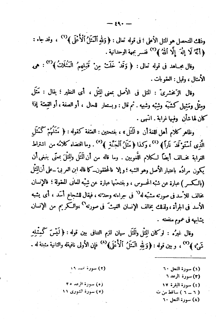 وَقَالَ غَيْرُهُ لَوْ كَانَ الْمَثَلُ وَالْمِثْلُ سِيَّانِ لَلَزِمَ التنافي بين قوله: {ليس كمثله شيء} وبين قوله: {ولله المثل الأعلى} فَإِنَّ الْأُولَى نَافِيَةٌ لَهُ وَالثَّانِيَةَ مُثْبِتَةٌ لَهُ