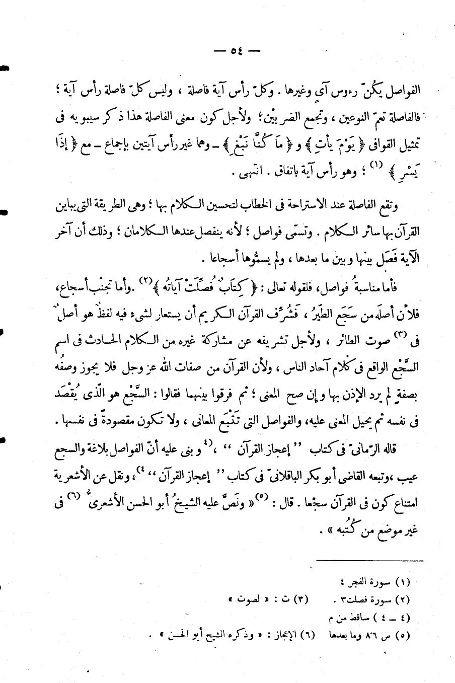 قال الرُّمَّانِيُّ فِي كِتَابِ إِعْجَازِ الْقُرْآنِ وَبَنَى عَلَيْهِ أَنَّ الْفَوَاصِلَ بَلَاغَةٌ وَالسَّجْعَ عَيْبٌ وَتَبِعَهُ الْقَاضِي أَبُو بَكْرٍ الْبَاقِلَّانِيُّ فِي كِتَابِ إِعْجَازِ الْقُرْآنِ وَنُقِلَ عَنِ الْأَشْعَرِيَّةِ امْتِنَاعُ كَوْنِ فِي الْقُرْآنِ سجعا قَالَ وَنَصَّ عَلَيْهِ الشَّيْخُ أَبُو الْحَسَنِ الْأَشْعَرِيُّ فِي غَيْرِ مَوْضِعٍ مِنْ كُتُبِهِ