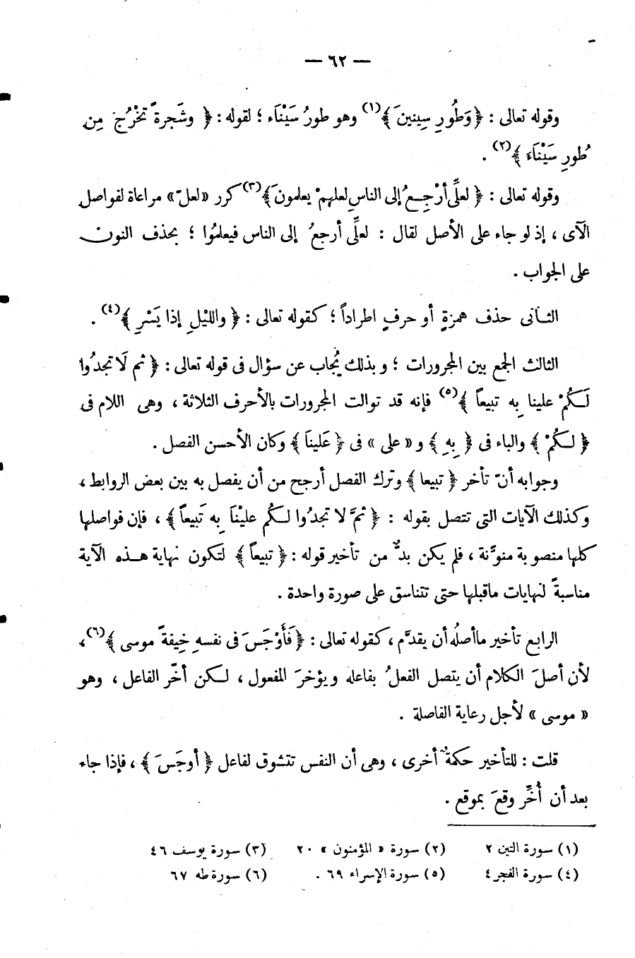 الرَّابِعُ: تَأْخِيرُ مَا أَصْلُهُ أَنْ يُقَدَّمَ كَقَوْلِهِ تَعَالَى: {فَأَوْجَسَ فِي نفسه خيفة موسى} لأن أصل الكلام أَنْ يَتَّصِلَ الْفِعْلُ بِفَاعِلِهِ وَيُؤَخَّرَ الْمَفْعُولُ لَكِنْ أُخِّرَ الْفَاعِلُ وَهُوَ مُوسَى لِأَجْلِ رِعَايَةِ الْفَاصِلَةِ