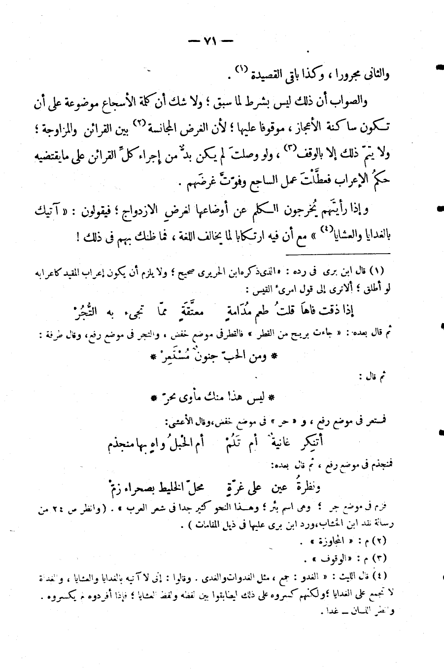 وَإِذَا رَأَيْتَهُمْ يُخْرِجُونَ الْكَلِمَ عَنْ أَوْضَاعِهَا لِغَرَضِ الِازْدِوَاجِ فَيَقُولُونَ آتِيكَ بِالْغَدَايَا وَالْعَشَايَا مَعَ أَنَّ فِيهِ ارْتِكَابًا لِمَا يُخَالِفُ اللُّغَةَ فَمَا ظَنُّكَ بِهِمْ في ذلك