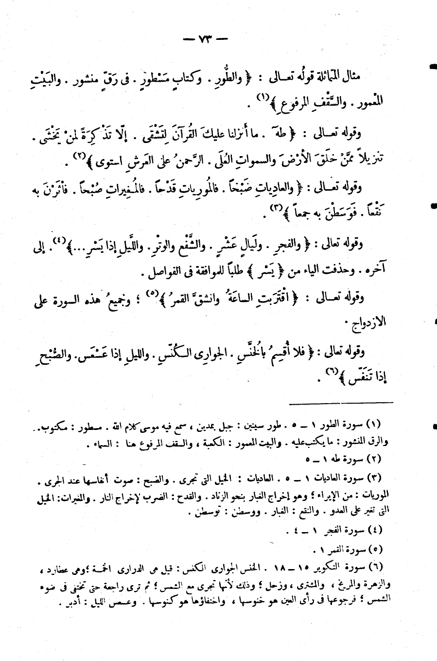 وَقَوْلُهُ تَعَالَى {وَالْفَجْرِ وَلَيَالٍ عَشْرٍ وَالشَّفْعِ وَالْوَتْرِ والليل إذا يسر} إِلَى آخِرِهِ وَحُذِفَتِ الْيَاءُ مَنْ {يَسْرِ} طَلَبًا لِلْمُوَافَقَةِ فِي الْفَوَاصِلِ