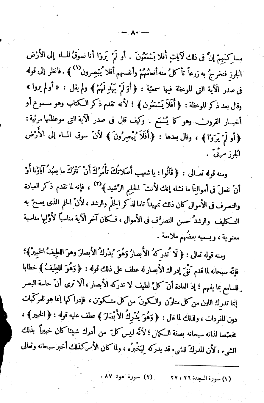 مَسَاكِنِهِمْ إِنَّ فِي ذَلِكَ لَآيَاتٍ أَفَلَا يَسْمَعُونَ أَوَلَمْ يَرَوْا أَنَّا نَسُوقُ الْمَاءَ إِلَى الْأَرْضِ الْجُرُزِ فَنُخْرِجُ بِهِ زَرْعًا تَأْكُلُ مِنْهُ أَنْعَامُهُمْ وأنفسهم أفلا يبصرون} فَانْظُرْ إِلَى قَوْلِهِ فِي صَدْرِ الْآيَةِ الَّتِي الْمَوْعِظَةُ فِيهَا سَمْعِيَّةٌ {أَوَلَمْ يَهْدِ لَهُمْ} وَلَمْ يَقُلْ أَوَلَمْ يَرَوْا وَقَالَ بَعْدَ ذِكْرِ الْمَوْعِظَةِ: {أفلا يسمعون} لأنه تَقَدَّمَ ذِكْرُ الْكِتَابِ وَهُوَ مَسْمُوعٌ أَوْ أَخْبَارُ القرون وهو كما يُسْمَعُ وَكَيْفَ قَالَ فِي صَدْرِ الْآيَةِ الَّتِي مَوْعِظَتِهَا مَرْئِيَّةٌ: {أَوْلَمَ يَرَوْا} وَقَالَ بَعْدَهَا أَفَلَا يُبْصِرُونَ لِأَنَّ سَوْقَ الْمَاءِ إِلَى الْأَرْضِ الْجُرُزِ مرئي.