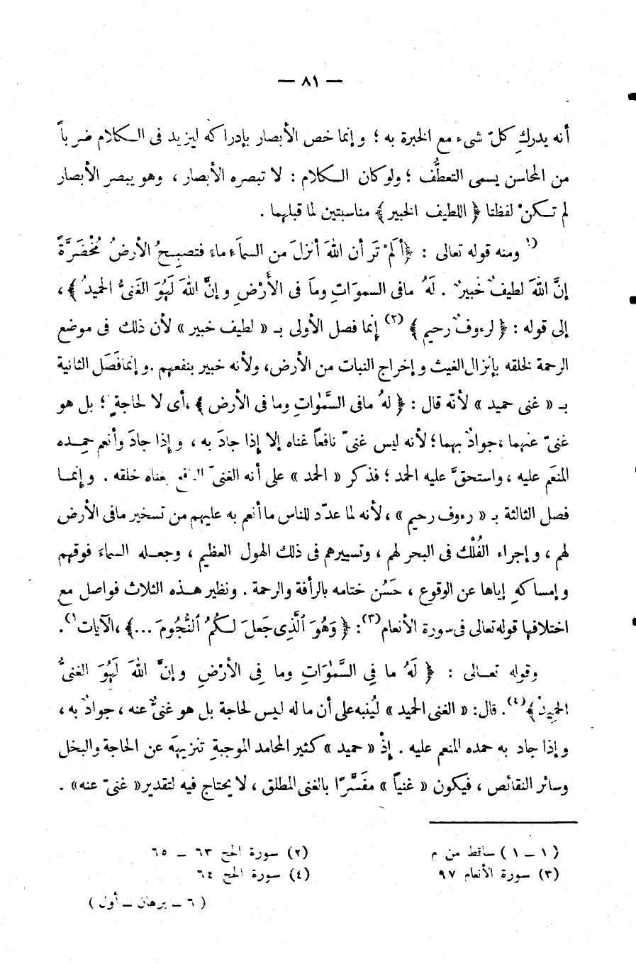 إلى قوله {لرؤوف رحيم} إِنَّمَا فَصَّلَ الْأُولَى بِـ لَطِيفٌ خَبِيرٌ لِأَنَّ ذَلِكَ فِي مَوْضِعِ الرَّحْمَةِ لِخَلْقِهِ بِإِنْزَالِ الْغَيْثِ وَإِخْرَاجِ النَّبَاتِ مِنَ الْأَرْضِ وَلِأَنَّهُ خَبِيرٌ بِنَفْعِهِمْ وَإِنَّمَا فَصَّلَ الثَّانِيَةَ بِـ غَنِيٌّ حَمِيدٌ لِأَنَّهُ قَالَ: {لَهُ مَا فِي السَّمَاوَاتِ وَمَا فِي الْأَرْضِ} أَيْ لَا لِحَاجَةٍ بَلْ هُوَ غَنِيٌّ عَنْهُمَا جَوَادٌ بِهِمَا لِأَنَّهُ لَيْسَ غَنِيٌّ نَافِعًا غِنَاهُ إِلَّا إِذَا جَادَ بِهِ وَإِذَا جَادَ وَأَنْعَمَ حَمِدَهُ الْمُنْعِمُ عَلَيْهِ وَاسْتَحَقَّ عَلَيْهِ الْحَمْدَ فذكر الحمد عَلَى أَنَّهُ الْغَنِيُّ النَّافِعُ بِغِنَاه خَلْقَهُ وَإِنَّمَا فصل الثالثة بـ رؤوف رَحِيمٌ لِأَنَّهُ لَمَّا عَدَّدَ لِلنَّاسِ مَا أَنْعَمَ بِهِ عَلَيْهِمْ مِنْ تَسْخِيرِ مَا فِي الْأَرْضِ لَهُمْ وَإِجْرَاءِ الْفُلْكِ فِي الْبَحْرِ لَهُمْ وَتَسْيِيرِهِمْ فِي ذَلِكَ الْهَوْلِ الْعَظِيمِ وَجَعْلِهِ السَّمَاءَ فَوْقَهُمْ وَإِمْسَاكِهِ إِيَّاهَا عَنِ الْوُقُوعِ حَسُنَ خِتَامُهُ بِالرَّأْفَةِ وَالرَّحْمَةِ