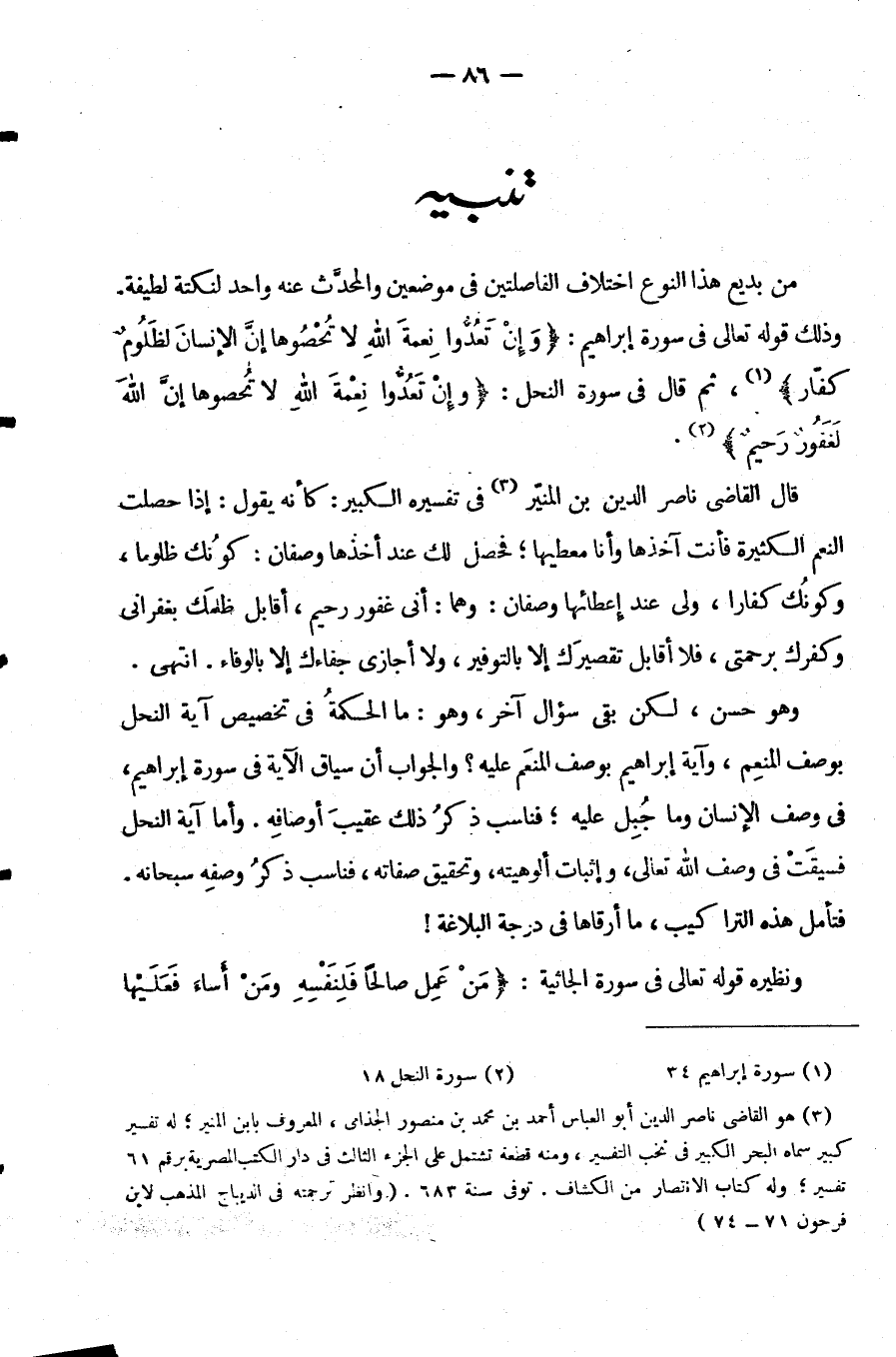 وَهُوَ حَسَنٌ لَكِنْ بَقِيَ سُؤَالٌ آخَرُ وَهُوَ مَا الْحِكْمَةُ فِي تخصيص آية النحل بوصف المنعم وَآيَةِ إِبْرَاهِيمَ بِوَصْفِ الْمُنْعَمِ عَلَيْهِ؟ وَالْجَوَابُ أَنَّ سِيَاقَ الْآيَةِ فِي سُورَةِ إِبْرَاهِيمَ فِي وَصْفِ الْإِنْسَانِ وَمَا جُبِلَ عَلَيْهِ فَنَاسَبَ ذِكْرُ ذَلِكَ عُقَيْبَ أَوْصَافِهِ وَأَمَّا آيَةُ النَّحْلِ فَسِيقَتْ فِي وَصْفِ اللَّهِ تَعَالَى وَإِثْبَاتِ أُلُوهِيَّتِهِ وَتَحْقِيقِ صِفَاتِهِ فَنَاسَبَ ذِكْرَ وَصْفِهِ سُبْحَانَهُ فَتَأَمَّلْ هَذِهِ التَّرَاكِيبَ مَا أَرْقَاهَا فِي دَرَجَةِ الْبَلَاغَةِ