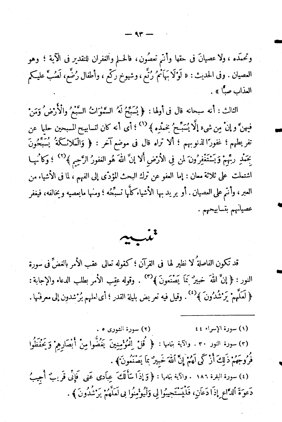 الثَّالِثُ: أَنَّهُ سُبْحَانَهُ قَالَ فِي أَوَّلِهَا: {تُسَبِّحُ لَهُ السَّمَاوَاتُ السَّبْعُ وَالْأَرْضُ وَمَنْ فِيهِنَّ وَإِنْ مِنْ شيء إلا يسبح بحمده} ، أَيْ أَنَّهُ كَانَ لِتَسَابِيحِ الْمُسَبِّحِينَ حَلِيمًا عَنْ تَفْرِيطِهِمْ غَفُورًا لِذُنُوبِهِمْ أَلَا تَرَاهُ قَالَ فِي مَوْضِعٍ آخَرَ: {وَالْمَلَائِكَةُ يُسَبِّحُونَ بِحَمْدِ رَبِّهِمْ وَيَسْتَغْفِرُونَ لِمَنْ فِي الْأَرْضِ أَلَا إِنَّ اللَّهَ هُوَ الغفور الرحيم} وَكَأَنَّهَا اشْتَمَلَتْ عَلَى ثَلَاثَةِ مَعَانٍ إِمَّا الْعَفْوُ عَنْ تَرْكِ الْبَحْثِ الْمُؤَدِّي إِلَى الْفَهْمِ لِمَا فِي الْأَشْيَاءِ مِنَ الْعِبَرِ وَأَنْتُمْ عَلَى الْعِصْيَانِ أَوْ يُرِيدُ بِهَا الْأَشْيَاءَ كُلَّهَا تُسَبِّحُهُ وَمِنْهَا مَا يَعْصِيهِ وَيُخَالِفُهُ فَيَغْفِرُ عِصْيَانَهُمْ بِتَسَابِيحِهِمْ.