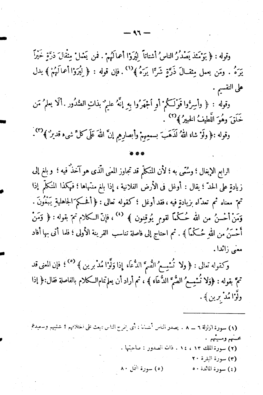 وَكَقَوْلِهِ تَعَالَى: {وَلَا تُسْمِعُ الصُّمَّ الدُّعَاءَ إذا ولوا مدبرين} فَإِنَّ الْمَعْنَى قَدْ تَمَّ بِقَوْلِهِ: {وَلَا تُسْمِعُ الصُّمَّ الدُّعَاءَ} ثُمَّ أَرَادَ أَنْ يُعْلَمَ تَمَامُ الْكَلَامِ بِالْفَاصِلَةِ فَقَالَ: {إِذَا وَلَّوْا مُدْبِرِينَ}