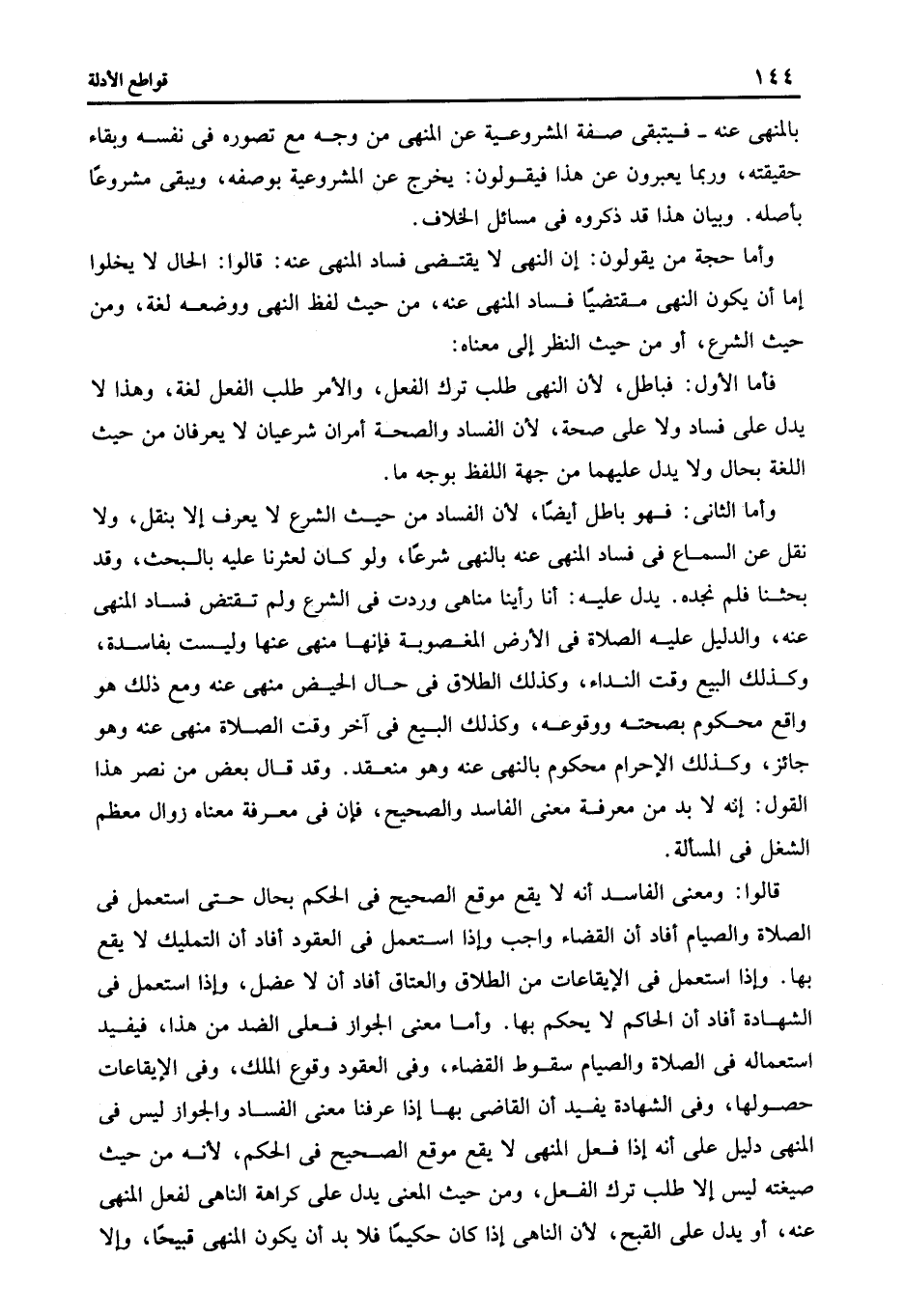 وأما الثانى فهو باطل أيضا لأن الفساد من حيث الشرع لا يعرف إلا بنقل ولا نقل عن السماع فى فساد المنهى عنه بالنهى شرعا ولو كان لعثرنا عليه بالبحث وقد بحثنا فلم نجده يدل عليه أنا رأينا مناهى وردت فى الشرع ولم تقتض فساد المنهى عنه والدليل عليه الصلاة فى الأرض المغصوبة فإنها منهى عنها وليست بفاسدة وكذلك البيع وقت النداء وكذلك الطلاق فى حال الحيض منهى عنه ومع ذلك هو واقع محكوم بصحته ووقوعه وكذلك البيع فى آخر وقت الصلاة منهى عنه وهو جائز وكذلك الإحرام محكوم بالنهى عنه وهو منعقد وقد قال بعض من نصر هذا القول أنه لابد من معرفة معنى الفاسد والصحيح فإن فى معرفة معناه زوال معظم الشغل فى المسألة.