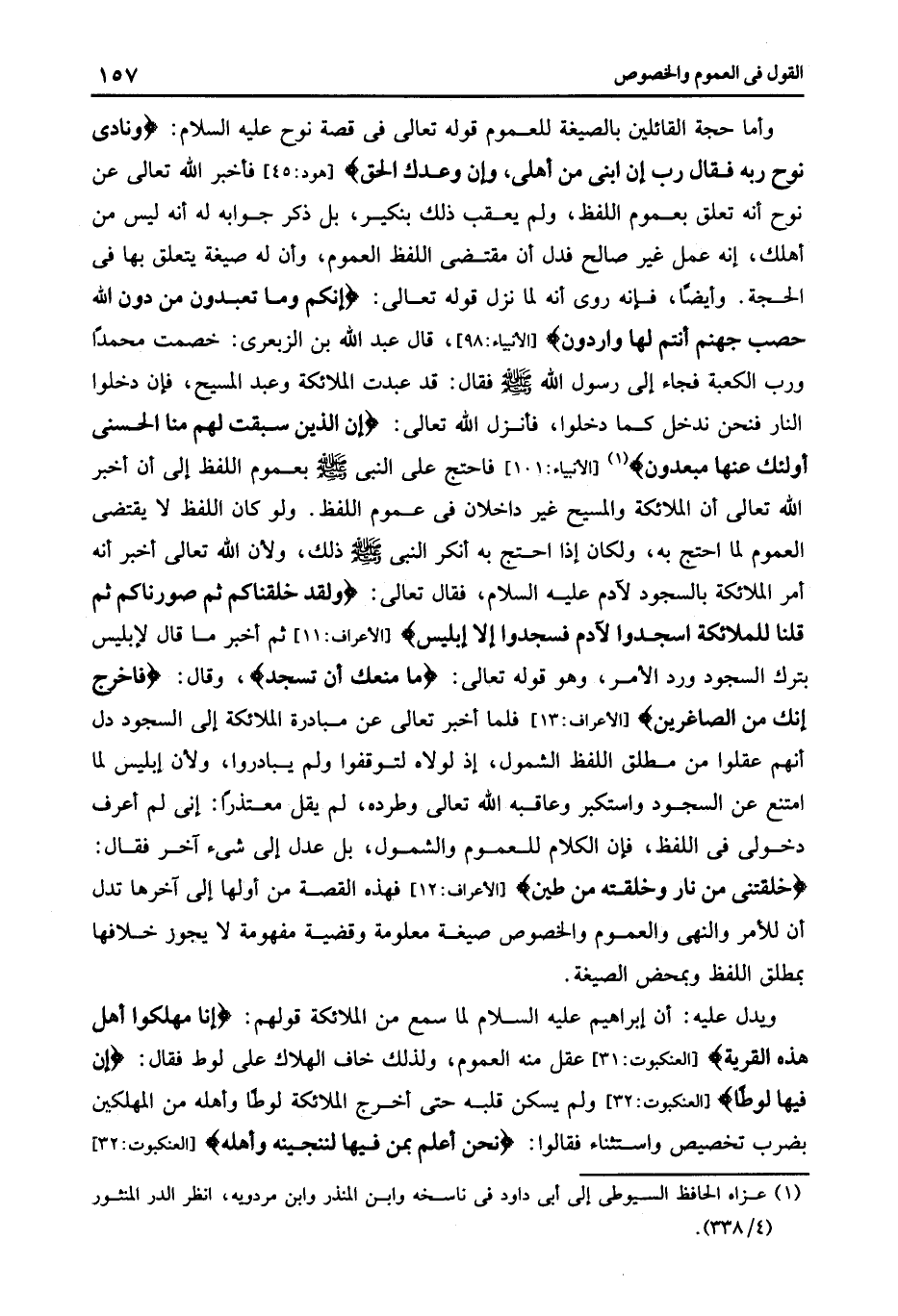 وأما حجة القائلين بالصيغة للعموم قوله تعالى فى قصة نوح عليه السلام: {وَنَادَى نُوحٌ رَبَّهُ فَقَالَ رَبِّ إِنَّ ابْنِي مِنْ أَهْلِي وَإِنَّ وَعْدَكَ الْحَقُّ} [هود: 45] فأخبر الله تعالى عن نوح أنه تعلق بعموم اللفظ ولم يعقب ذلك بنكير بل ذكر جوابه له أنه ليس من أهلك أنه عمل غير صالح فدل أن مقتضى اللفظ العموم وأن له صيغة يتعلق بها فى الحجة وأيضا فإنه روى أنه لما نزل قوله تعالى: {إِنَّكُمْ وَمَا تَعْبُدُونَ مِنْ دُونِ اللَّهِ حَصَبُ جَهَنَّمَ أَنْتُمْ لَهَا وَارِدُونَ} [الانبياء:98] قال عبد الله بن الزبعرى خصمت محمدا ورب الكعبة فجاء إلى رسول الله صلى الله عليه وسلم فقال قد عبدت الملائكة وعبد المسيح فإن دخلوا النار فنحن ندخل كما دخلوا فأنزل الله تعالى: {إِنَّ الَّذِينَ سَبَقَتْ لَهُمْ مِنَّا الْحُسْنَى أُولَئِكَ عَنْهَا مُبْعَدُونَ} 1 [الانبياء:101] فاحتج على النبي صلى الله عليه وسلم بعموم اللفظ إلى أن أخبر الله تعالى أن الملائكة والمسيح غير داخلان فى عموم اللفظ ولو كان اللفظ لا يقتضى العموم لما احتج به ولكان إذا احتج به أنكر النبي صلى الله عليه وسلم ذلك ولأن الله تعالى أخبر أنه أمر الملائكة بالسجود لآدم عليه السلام فقال تعالى: {وَلَقَدْ خَلَقْنَاكُمْ ثُمَّ صَوَّرْنَاكُمْ ثُمَّ قُلْنَا لِلْمَلائِكَةِ اسْجُدُوا لِآدَمَ فَسَجَدُوا إِلَّا إِبْلِيسَ} [الأعراف: 11] ثم أخبر ما قال لإبليس بترك السجود ورد الأمر وهو قوله تعالى: {مَا مَنَعَكَ أَنْ تَسْجُدَ} [صّ: 75] وقال: {فَاخْرُجْ إِنَّكَ مِنَ الصَّاغِرِينَ} [الأعراف: 13] فلما أخبر تعالى عن مبادرة الملائكة إلى السجود دل أنهم عقلوا من مطلق اللفظ الشمول إذ لولاه لتوقفوا ولم يبادروا ولأن إبليس لما امتنع عن السجود واستكبر وعاقبه الله تعالى وطرده لم يقل معتذرا إنى لم أعرف دخولى فى اللفظ فإن الكلام للعموم والشمول بل عدل إلى شىء آخر فقال: {خَلَقْتَنِي مِنْ نَارٍ وَخَلَقْتَهُ مِنْ طِينٍ} [الأعراف: 12] فهذه القصة من أولها إلى آخرها تدل أن للأمر والنهى والعموم والخصوص صيغة معلومة وقضية مفهومة لا يجوز خلافها بمطلق اللفظ وبمحض الصيغة.