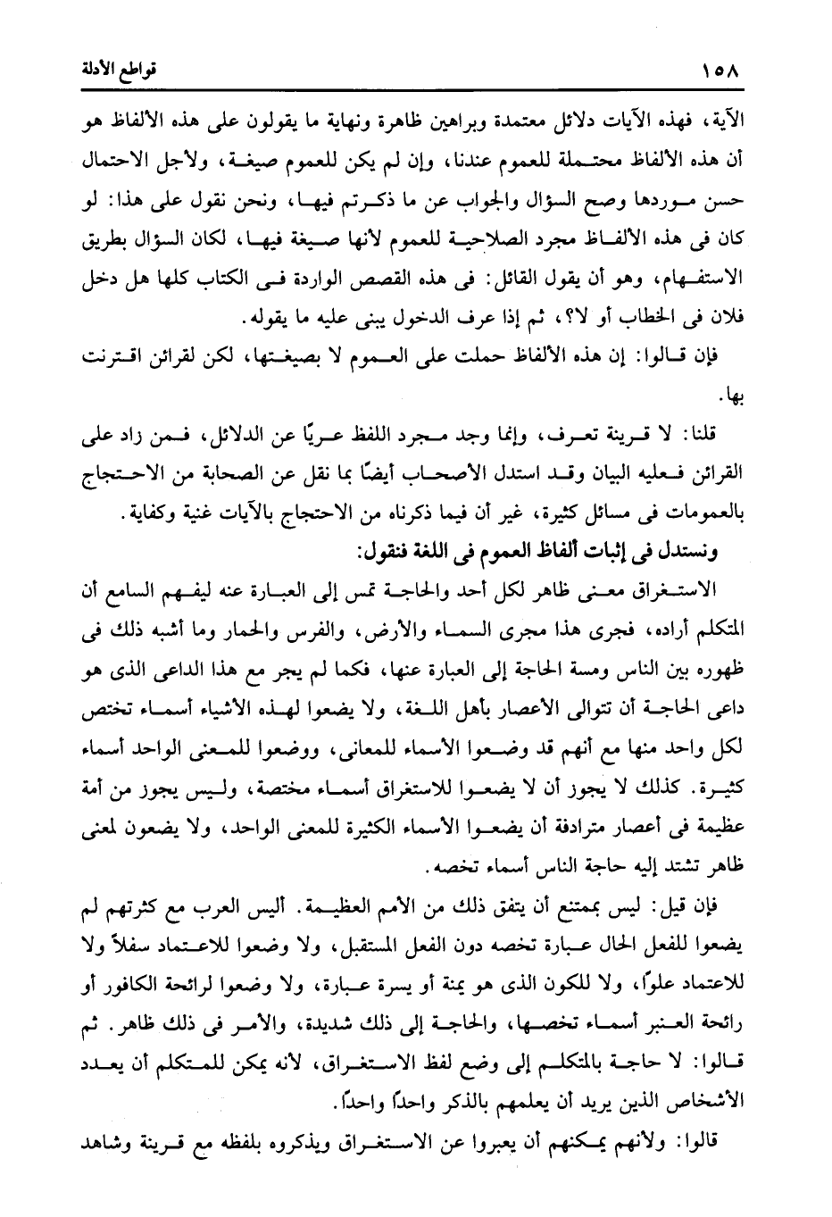 الاستغراق معنى ظاهر لكل أحد والحاجة تمس إلى العبارة عنه ليفهم السامع أن المتكلم أراده فجرى هذا مجرى السماء والأرض والفرس والحمار وما أشبه ذلك فى ظهوره بين الناس ومسة الحاجة إلى العبارة عنها فكما لم يجر مع هذا الداعى الذى هو داعى الحاجة أن تتوالى الأعصار بأهل اللغة ولا يضعوا لهذه الأشياء أسماء تختص لكل واحد منها مع أنهم قد وضعوا الأسماء للمعانى ووضعوا للمعنى الواحد أسماء كثيرة كذلك لا يجوز أن لا يضعوا للاستغراق أسماء مختصة وليس يجوز من أمة عظيمة فى أعصار مترادفة أن يضعوا الأسماء الكثيرة للمعنى الواحد ولا يضعون لمعنى ظاهر تشتد إليه حاجة الناس أسماء تخصه.