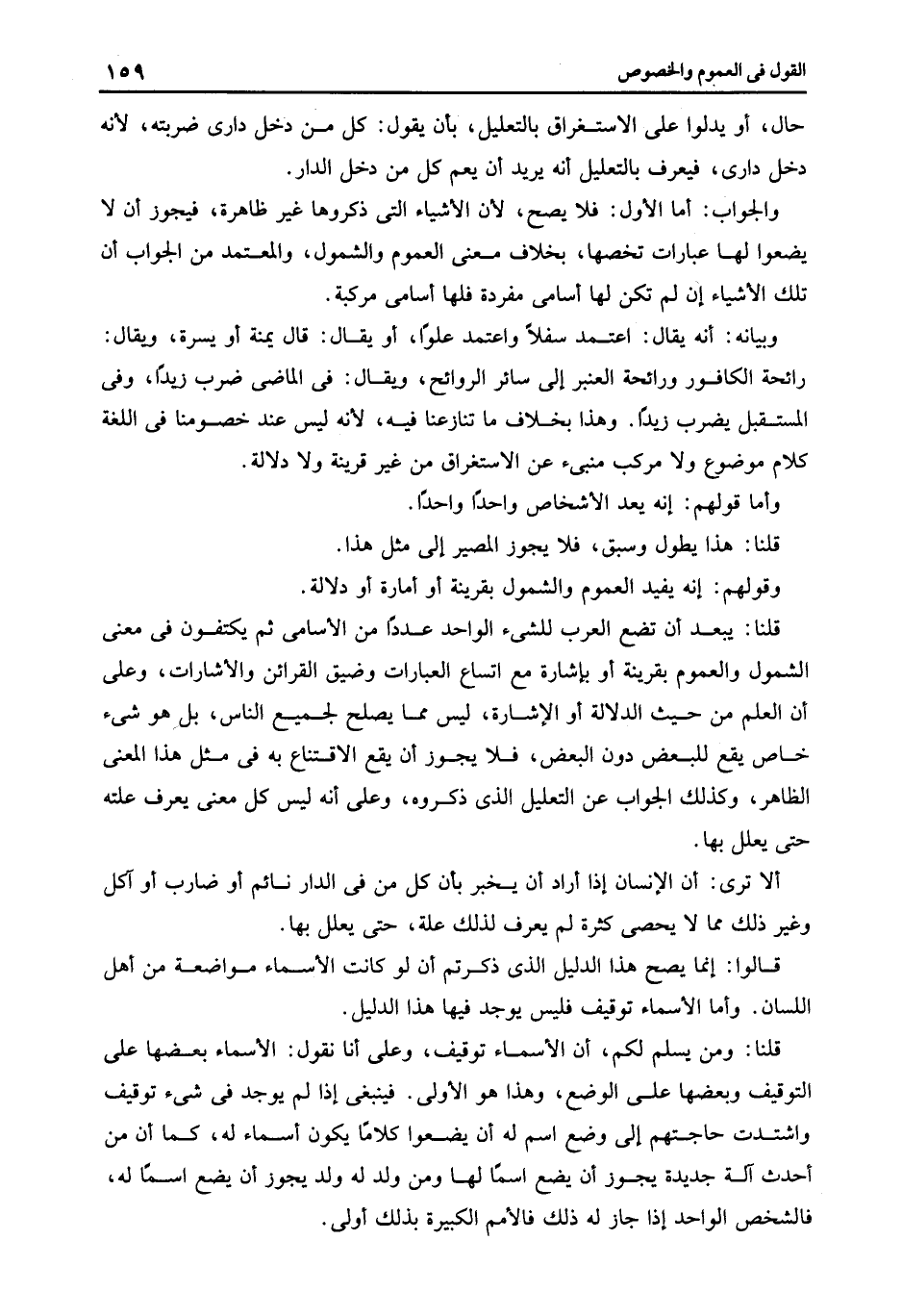 قلنا يبعد أن تضع العرب للشىء الواحد عددا من الأسامى ثم يكتفون فى معنى الشمول والعموم بقرينة أو بإشارة مع اتساع العبارات وضيق القرائن والأشارات وعلى أن العلم من حيث الدلالة أو الإشارة ليس مما يصلح لجميع الناس بل هو شىء خاص يقع للبعض دون البعض فلا يجوز أن يقع الاقتناع به فى مثل هذا المعنى الظاهر وكذلك الجواب عن التعليل الذى ذكروه وعلى أنه ليس كل معنى يعرف علته حتى يعلل بها.