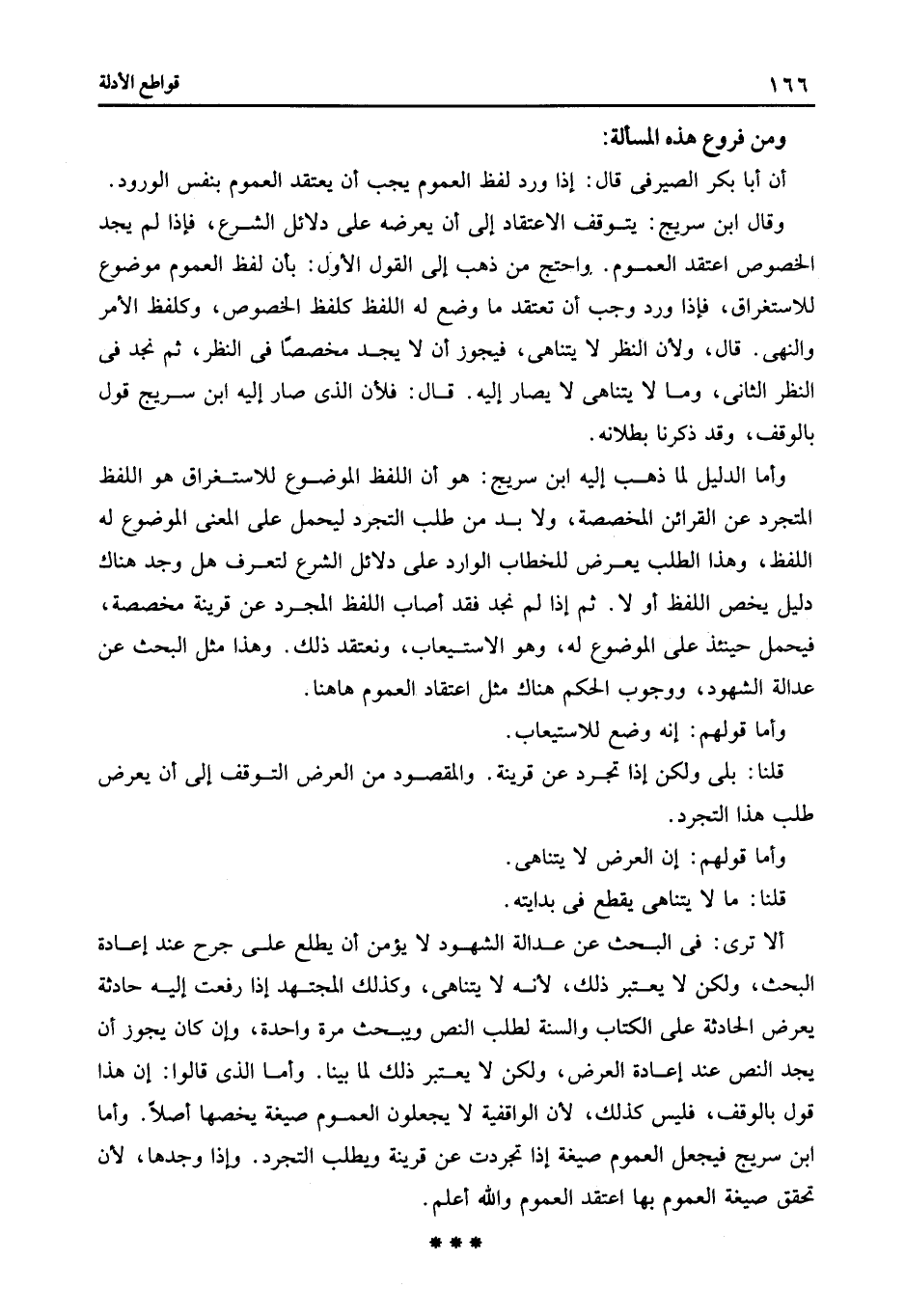 ألا ترى فى البحث عن عدالة الشهود لا يؤمن أن يطلع على جرح عند إعادة البحث ولكن لا يعتبر ذلك لأنه لا يتناهى وكذلك المجتهد إذا رفعت إليه حادثة يعرض الحادثة على الكتاب والسنة لطلب النص ويبحث مرة واحدة وأن كان يجوز أن يجد النص عند إعادة العرض ولكن لا يعتبر ذلك لما بينا وأما الذى قالوا: أن هذا قول بالوقف فليس كذلك لأن الواقفية لا يجعلون العموم صيغة يخصها أصلا وأما ابن سريج فيجعل العموم صيغة إذا تجردت عن قرينة ويطلب التجرد وإذا وجدها لأن تحقق صيغة العموم بها اعتقد العموم والله أعلم.