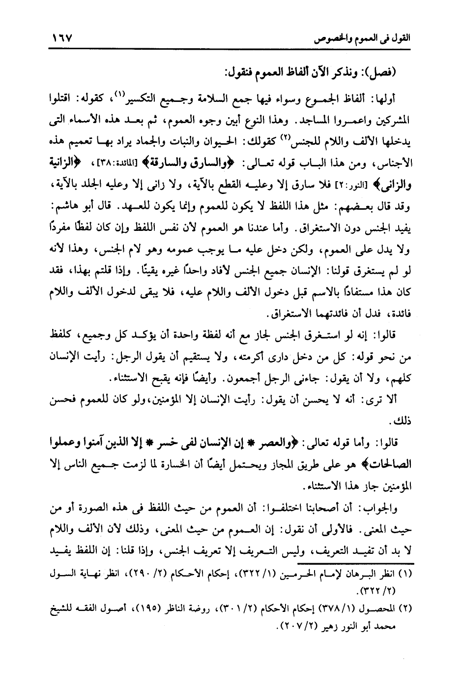 والجواب أن أصحابنا اختلفوا أن العموم من حيث اللفظ فى هذه الصورة أو من حيث المعنى فالأولى أن نقول أن العموم من حيث المعنى وذلك لأن الألف واللام لا بد أن تفيد التعريف وليس التعريف إلا تعريف الجنس وإذا قلنا أن اللفظ يفيد.