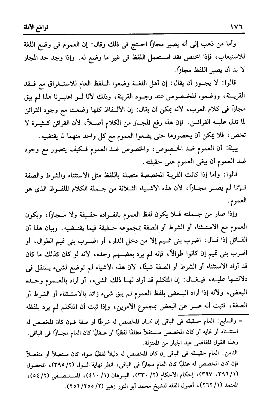 وإذا صار من جملته فلا يكون لفظ العموم بانفراده حقيقة ولا مجازا ويكون العموم مع الاستثناء أو الشرط أو الصفة بمجموعة حقيقة فيما يقتضيه وبيان هذا أن القائل إذا قال اضرب بنى تميم إلا من دخل الدار أو اضرب بنى تميم الطوال أو اضرب بنى تميم أن كانوا طوالا فإنه لم يرد بعضهم وحده لأنه لو كان كذلك ما كان قد أراد الاستثناء أو الشرط أو الصفة شيئا لأن هذه الأشياء لم توضع لشىء يستقل فى دلالتها عليه فيقال أن المتكلم قد أراد لها ذلك الشىء أو أراد بالعموم وحده البعض ولأنه إذا أراد البعض بلفظ العموم لم يبق شىء زائد بالاستثناء أو الشرط أو الصفة فثبت أنه عبر عن البعض بمجموع الأمرين وإذا ثبت أن المتكلم لم يرد بلفظه.