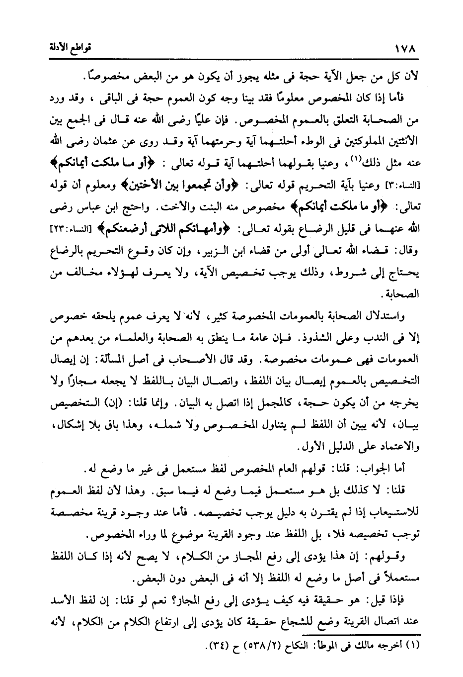 فأما إذا كان المخصوص معلوما فقد بينا وجه كون العموم حجة فى الباقى وقد ورد من الصحابة التعلق بالعموم المخصوص فإن عليا رضى الله عنه قال فى الجمع بين الأنثتين المملوكتين فى الوطء أحلتهما آية وحرمتهما آية وقد روى عن عثمان رضى الله عنه مثل ذلك1 وعنيا بقولهما أحلتهما آية قوله تعالى: {أَوْ مَا مَلَكَتْ أَيْمَانُكُمْ} وعنيا بآية التحريم قوله تعالى: {وَأَنْ تَجْمَعُوا بَيْنَ الْأُخْتَيْنِ} ومعلوم أن قوله تعالى: {أَوْ مَا مَلَكَتْ أَيْمَانُكُمْ} مخصوص منه البنت والأخت واحتج ابن عباس رضى الله عنهما فى قليل الرضاع بقوله تعالى: {وَأُمَّهَاتُكُمُ اللَّاتِي أَرْضَعْنَكُمْ} [النساء: 23] وقال قضاء الله تعالى أولى من قضاء ابن الزبير وأن كان وقوع التحريم بالرضاع يحتاج إلى شروط وذلك يوجب تخصيص الآية ولا يعرف لهؤلاء مخالف من الصحابة.