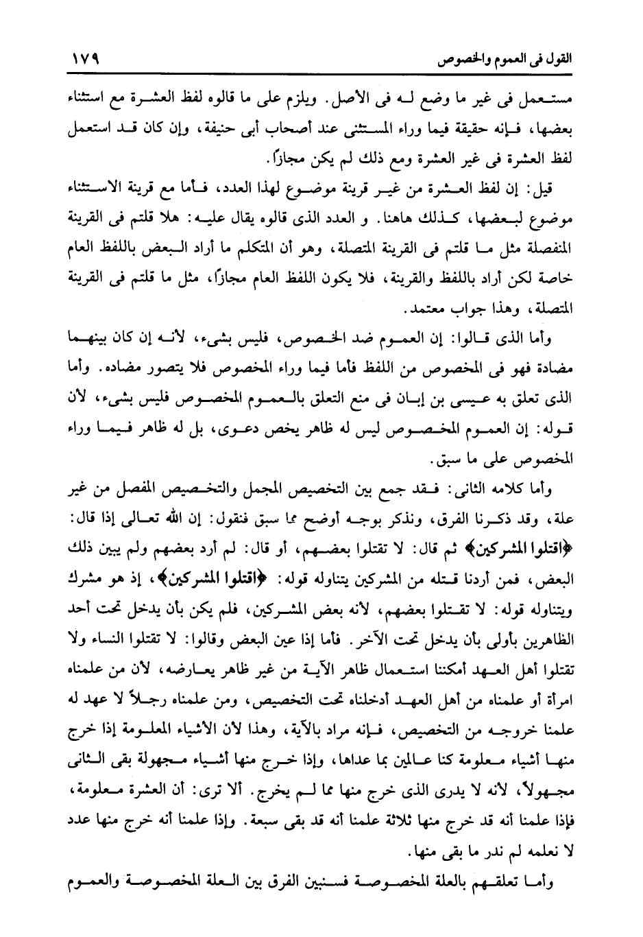 وأما كلامه الثانى فقد جمع بين التخصيص المجمل والتخصيص المفصل من غير علة وقد ذكرنا الفرق ونذكر بوجه أوضح مما سبق فنقول أن الله تعالى إذا قال: {فَاقْتُلُوا الْمُشْرِكِينَ} ثم قال لا تقتلوا بعضهم أو قال لم أرد بعضهم ولم يبين ذلك البعض فمن أردنا قتله من المشركين يتناوله قوله: {فَاقْتُلُوا الْمُشْرِكِينَ} إذ هو مشرك ويتناوله قوله لا تقتلوا بعضهم لأنه بعض المشركين فلم يكن بأن يدخل تحت أحد الظاهرين بأولى بأن يدخل تحت الآخر فأما إذا عين البعض وقالوا: لا تقتلوا النساء ولا تقتلوا أهل العهد أمكننا استعمال ظاهر الآية من غير ظاهر يعارضه لأن من علمناه امرأة أو علمناه من أهل العهد أدخلناه تحت التخصيص ومن علمناه رجلا لا عهد له علمنا خروجه من التخصيص فإنه مراد بالآية وهذا لأن الأشياء المعلومة إذا خرج منها أشياء معلومة كنا عالمين بما عداها وإذا خرج منها أشياء مجهولة بقى الثانى مجهولا لأنه لا يدرى الذى خرج منها مما لم يخرج ألا ترى أن العشرة معلومة فإذا علمنا أنه قد خرج منها ثلاثة علمنا أنه قد بقى سبعة وإذا علمنا أنه خرج منها عدد لا نعلمه لم ندر ما بقى منها.