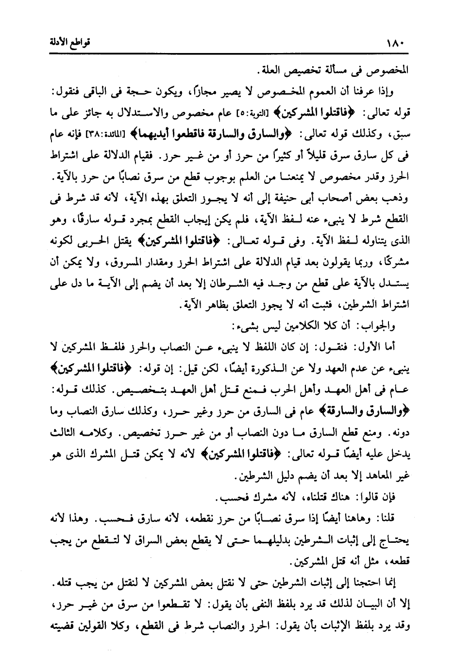 وإذا عرفنا أن العموم المخصوص لا يصير مجازا حجة فى الباقى فنقول قوله تعالى: {فَاقْتُلُوا الْمُشْرِكِينَ} [التوبة 5] عام مخصوص والاستدلال به جائز على ما سبق وكذلك قوله تعالى: {وَالسَّارِقُ وَالسَّارِقَةُ فَاقْطَعُوا أَيْدِيَهُمَا} [المائدة: 38] فإنه عام فى كل سارق سرق قليلا أو كثيرا من حرز أو من غير حرز فقيام الدلالة على اشتراط الحرز وقدر مخصوص لا يمنعنا من العلم بوجوب قطع من سرق نصابا من حرز بالآية وذهب بعض أصحاب أبى حنيفة إلى أنه لا يجوز التعلق بهذه الآية لأنه قد شرط فى القطع شرط لا ينبىء عنه لفظ الآية فلم يكن إيجاب القطع بمجرد قوله سارقا وهو الذى يتناوله لفظ الآية وفى قوله تعالى: {فَاقْتُلُوا الْمُشْرِكِينَ} يقتل الحربى لكونه مشركا وربما يقولون بعد قيام الدلالة على اشتراط الحرز ومقدار المسروق ولا يمكن أن يستدل بالآية على قطع من وجد فيه الشرطان إلا بعد أن يضم إلى الآية ما دل على اشتراط الشرطين فثبت أنه لا يجوز التعلق بظاهر الآية.