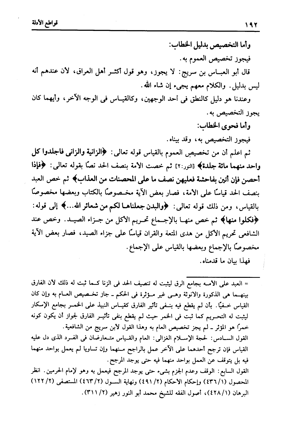 ثم اعلم أن من تخصيص العموم بالقياس قوله تعالى: {الزَّانِيَةُ وَالزَّانِي فَاجْلِدُوا كُلَّ وَاحِدٍ مِنْهُمَا مِائَةَ جَلْدَةٍ} [النور: 2] ثم خصت الأمة بنصف الحد نصا بقوله تعالى: {فَإِذَا أُحْصِنَّ فَإِنْ أَتَيْنَ بِفَاحِشَةٍ فَعَلَيْهِنَّ نِصْفُ مَا عَلَى الْمُحْصَنَاتِ مِنَ الْعَذَابِ} ثم خص العبد بنصف الحد قياسا على الأمة فصار بعض الآية مخصوصا بالكتاب وبعضها مخصوصا بالقياس ومن ذلك قوله تعالى: {وَالْبُدْنَ جَعَلْنَاهَا لَكُمْ مِنْ شَعَائِرِ اللَّهِ..} إلى قوله: {فَكُلُوا مِنْهَا} ثم خص منها بالإجماع تحريم الأكل من جزاء الصيد وخص عند الشافعى تحريم الأكل من هدى المتعة والقران قياسا على جزاء الصيد فصار بعض الآية مخصوصا بالإجماع وبعضها بالقياس على الإجماع.