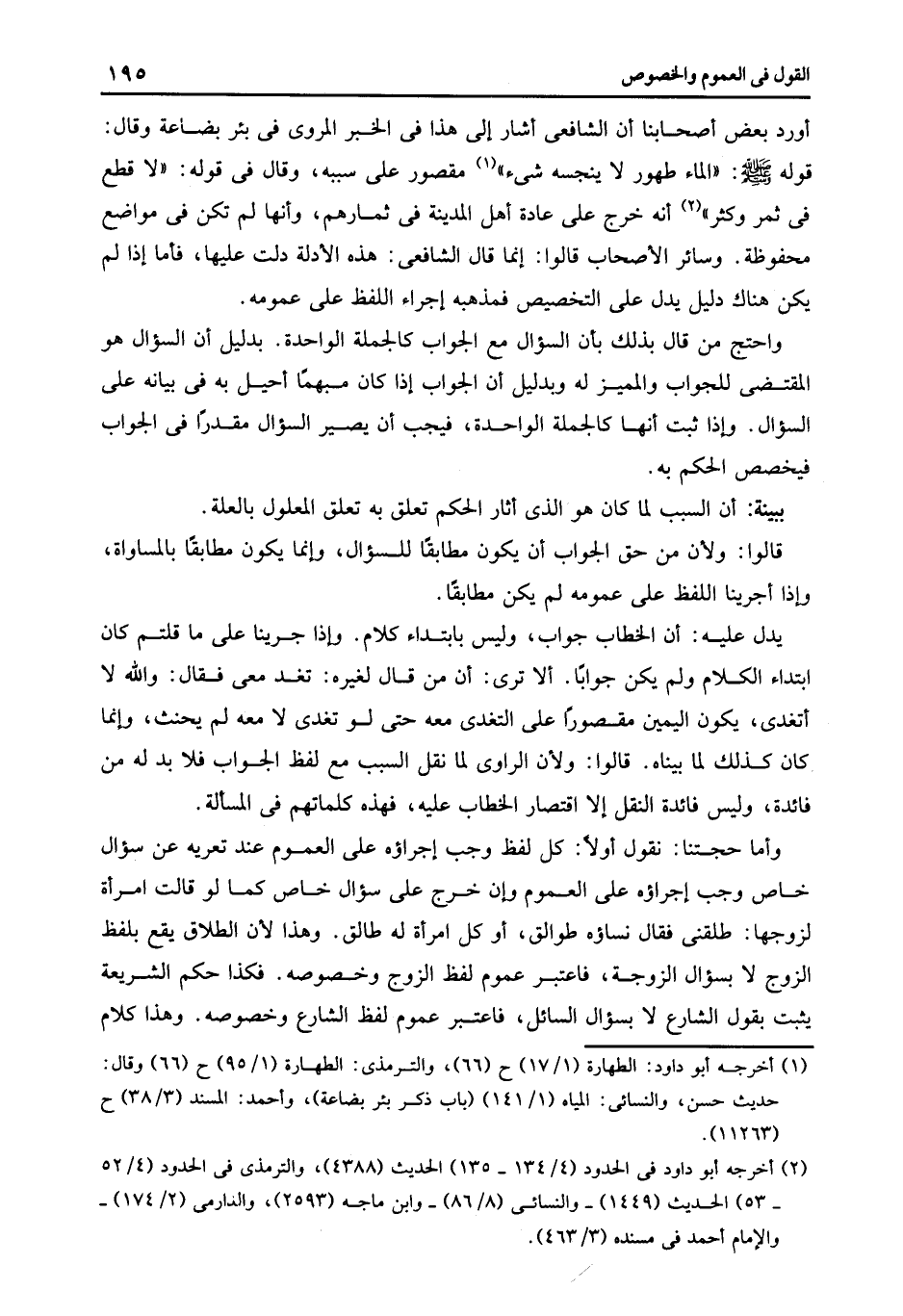 وأما حجتنا نقول أولا كل لفظ وجب إجراؤه على العموم عند تعريه عن سؤال خاص وجب إجراؤه على العموم وأن خرج على سؤال خاص كما لو قالت امرأة لزوجها طلقنى فقال نساؤه طوالق أو كل امرأة له طالق وهذا لأن الطلاق يقع بلفظ الزوج لا بسؤال الزوجة فاعتبر عموم لفظ الزوج وخصوصه فكذا حكم الشريعة يثبت بقول الشارع لا بسؤال السائل فاعتبر عموم لفظ الشارع وخصوصه وهذا كلام.