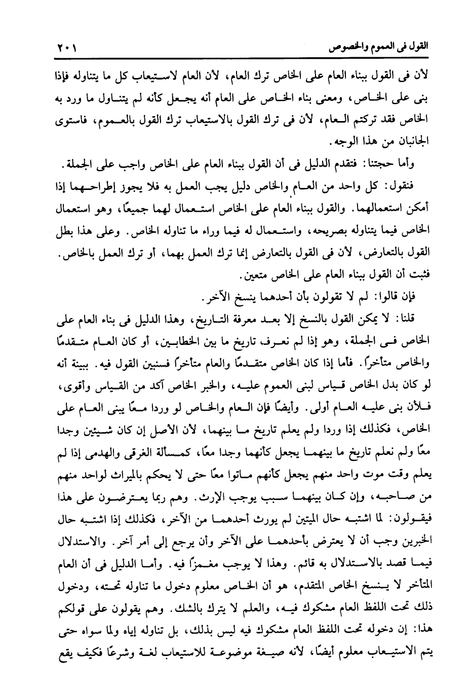 لأن فى القول ببناء العام على الخاص ترك العام لأن العام لاستيعاب كل ما يتناوله فإذا بنى على الخاص ومعنى بناء الخاص على العام أنه يجعل كأنه لم يتناول ما ورد به الخاص فقد تركتم العام لأن فى ترك القول بالاستيعاب ترك القول بالعموم فاستوى الجانبان من هذا الوجه
