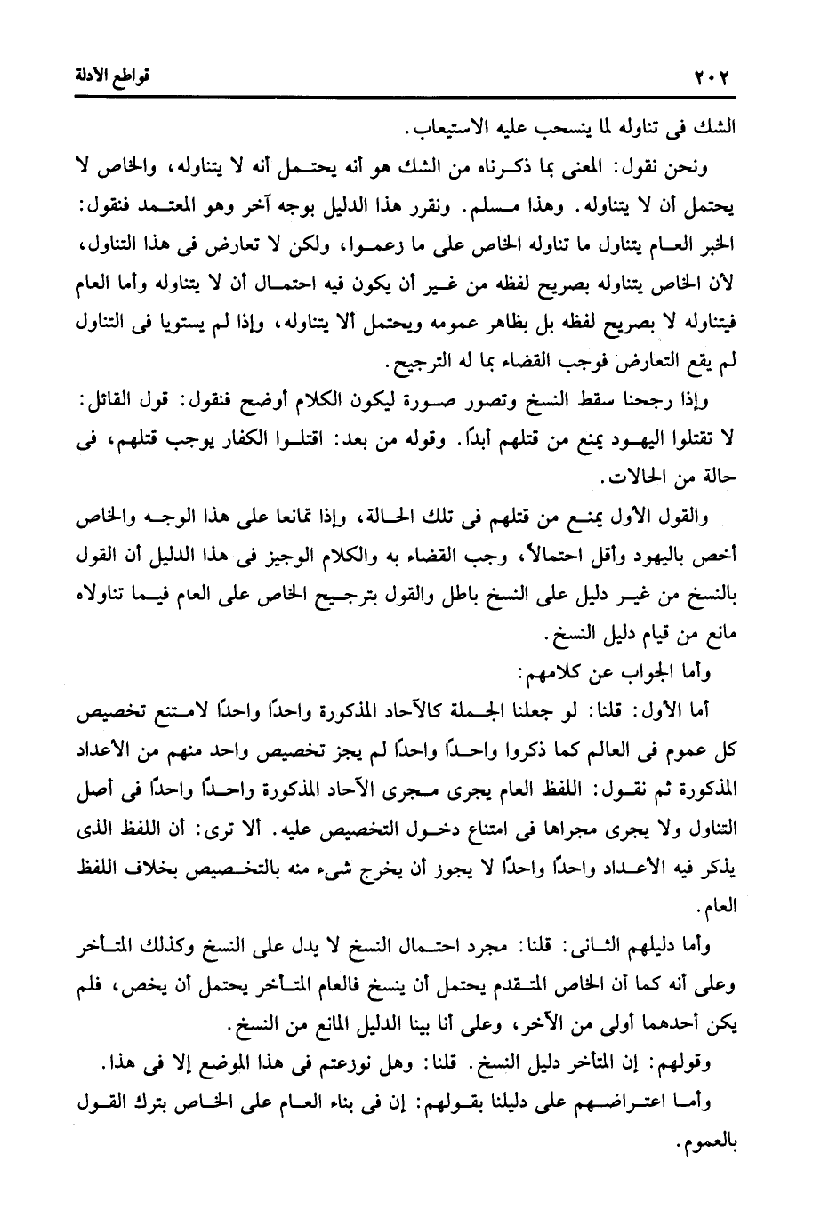 والقول الأول يمنع من قتلهم فى تلك الحالة وإذا تمانعا على هذا الوجه والخاص أخص باليهود وأقل احتمالا وجب القضاء به والكلام الوجيز فى هذا الدليل أن القول بالنسخ من غير دليل على النسخ باطل والقول بترجيح الخاص على العام فيما تناولاه مانع من قيام دليل النسخ.